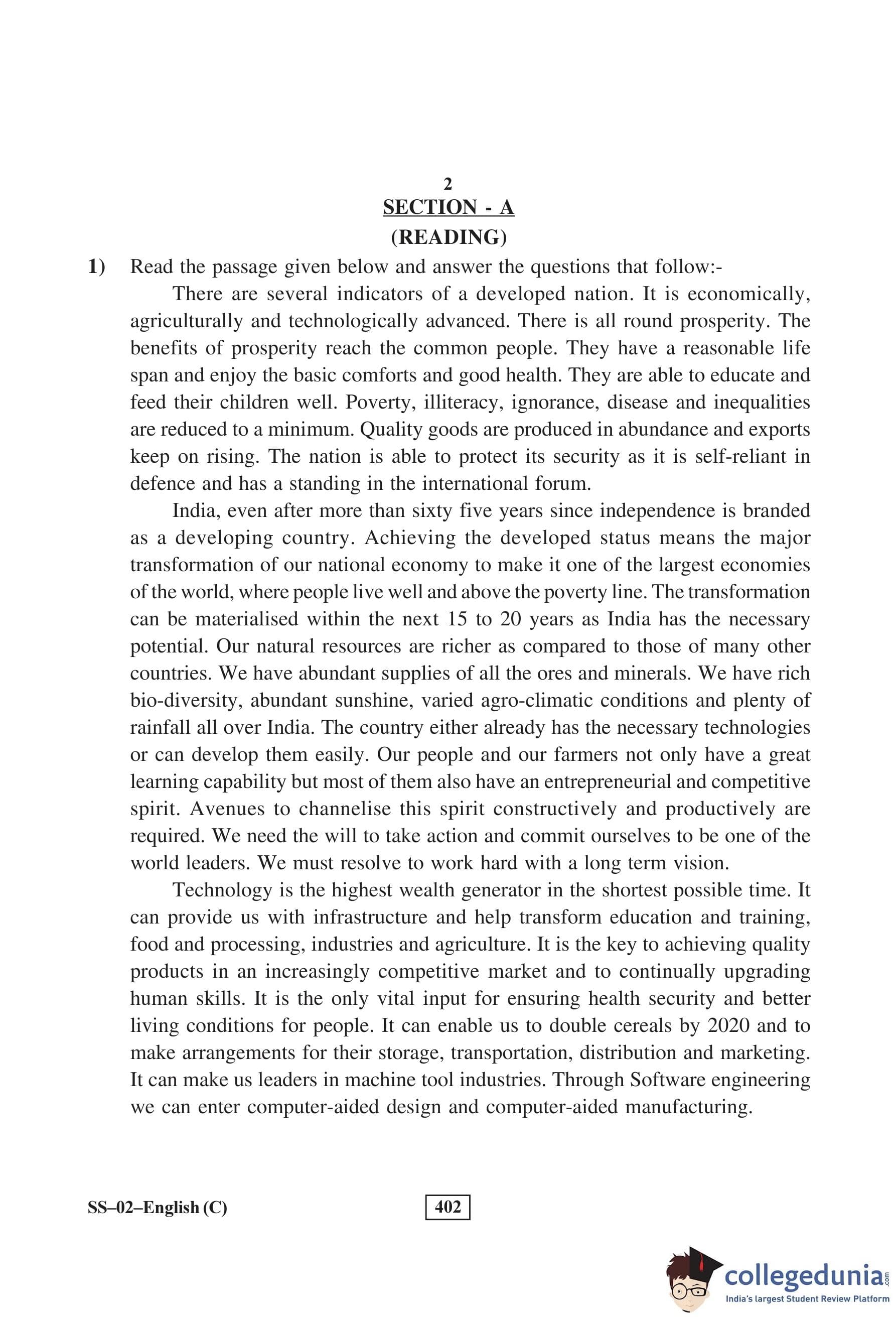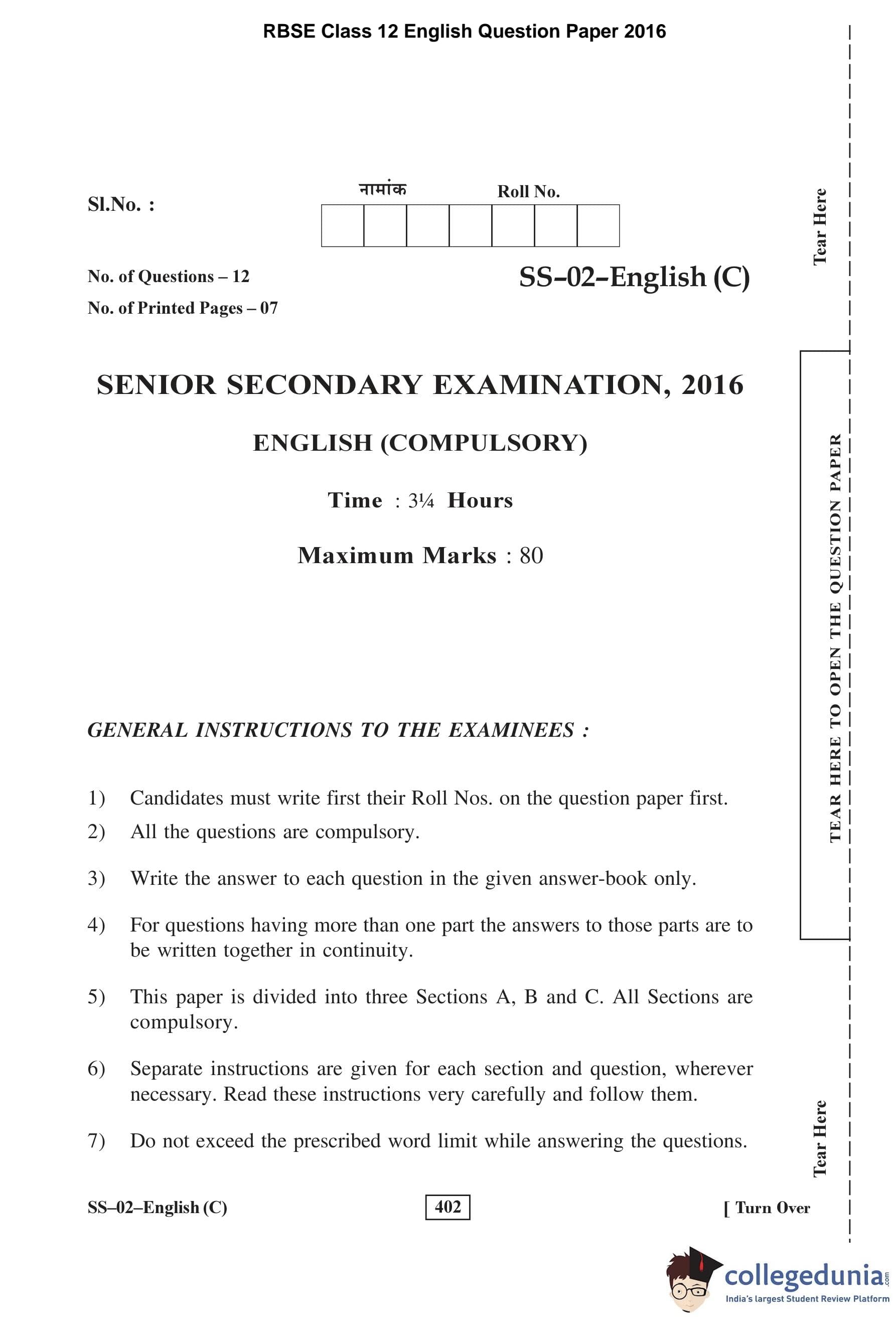 RBSE Class 12 English Question Paper 2016 with Answer Key
