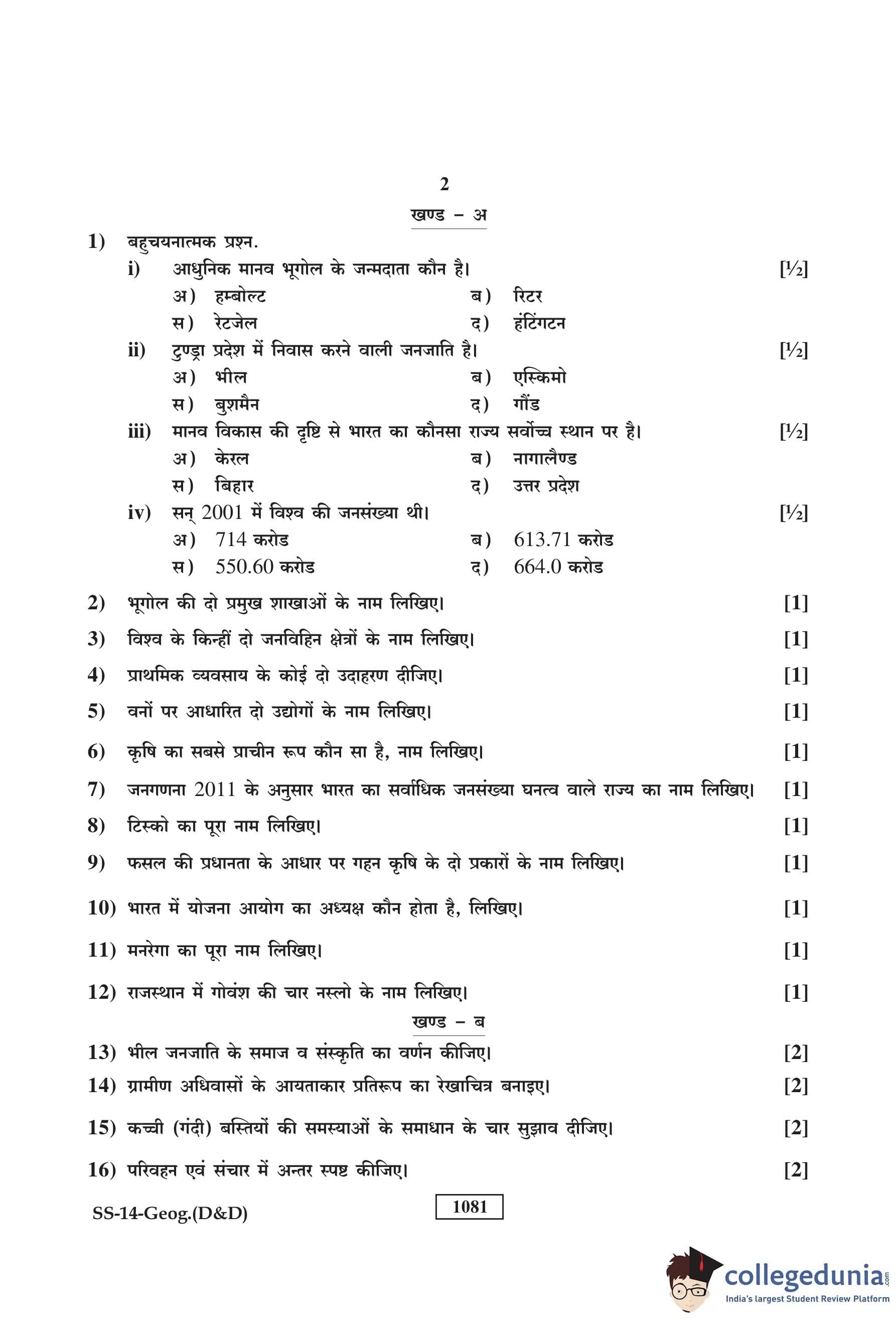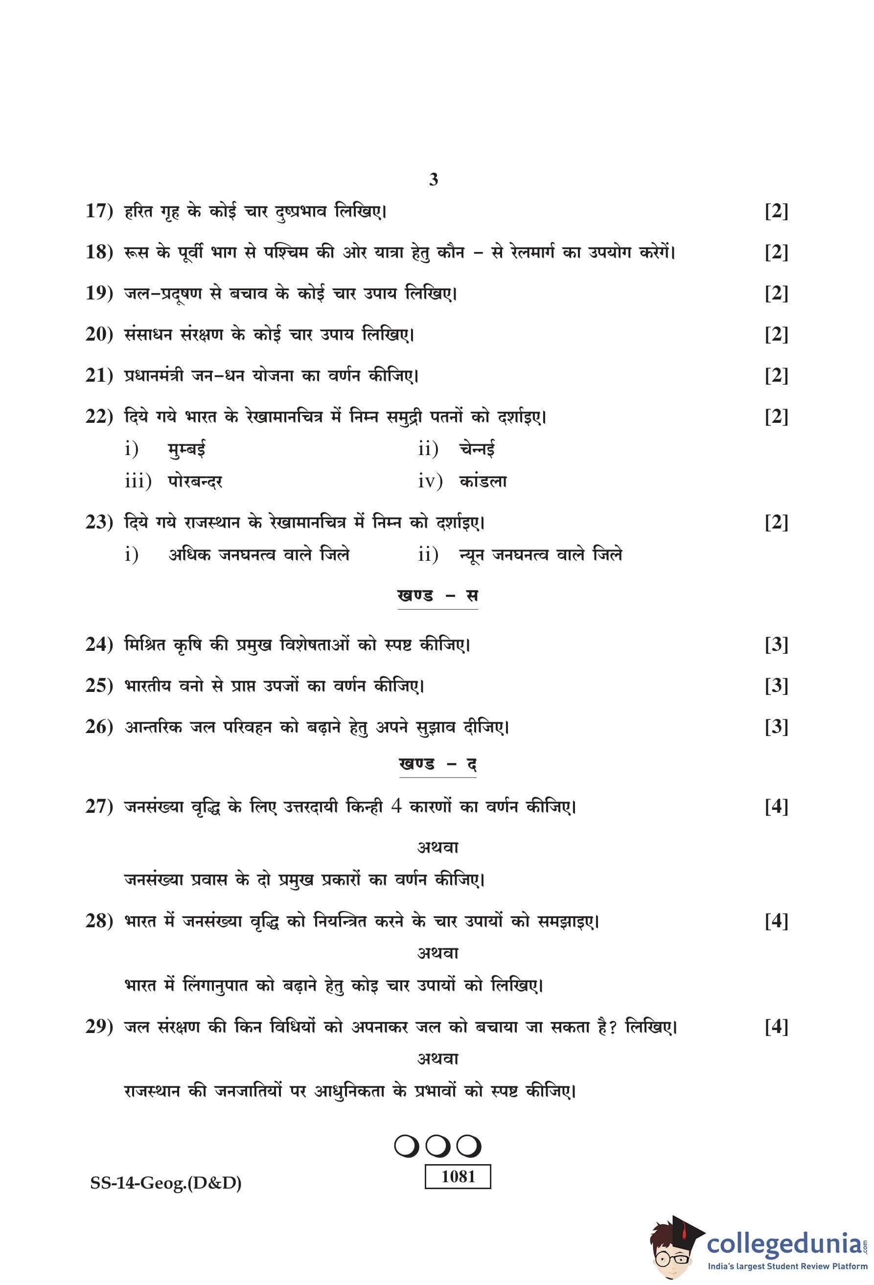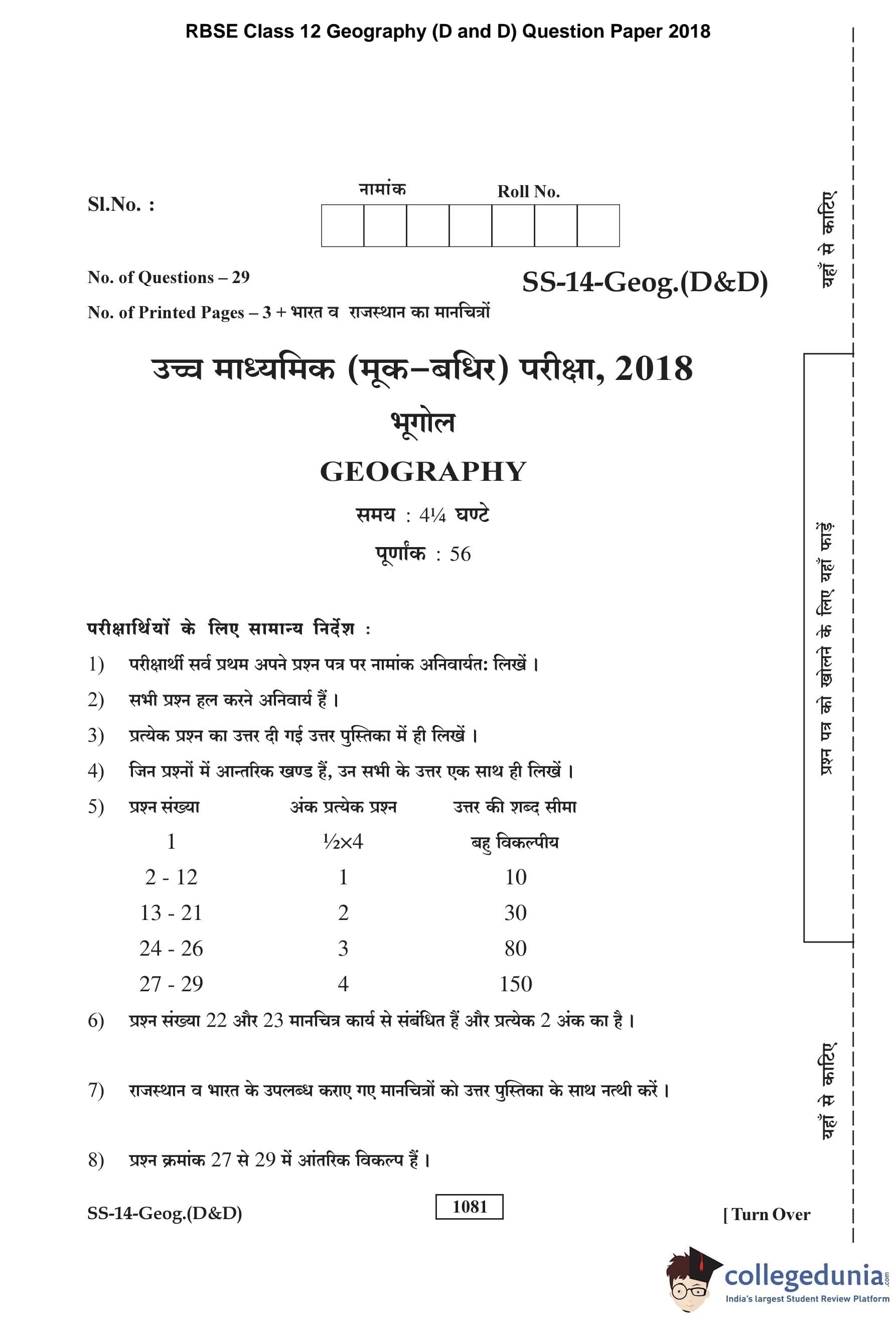 RBSE Class 12 Geography (D and D) Question Paper 2018 with Answer Key