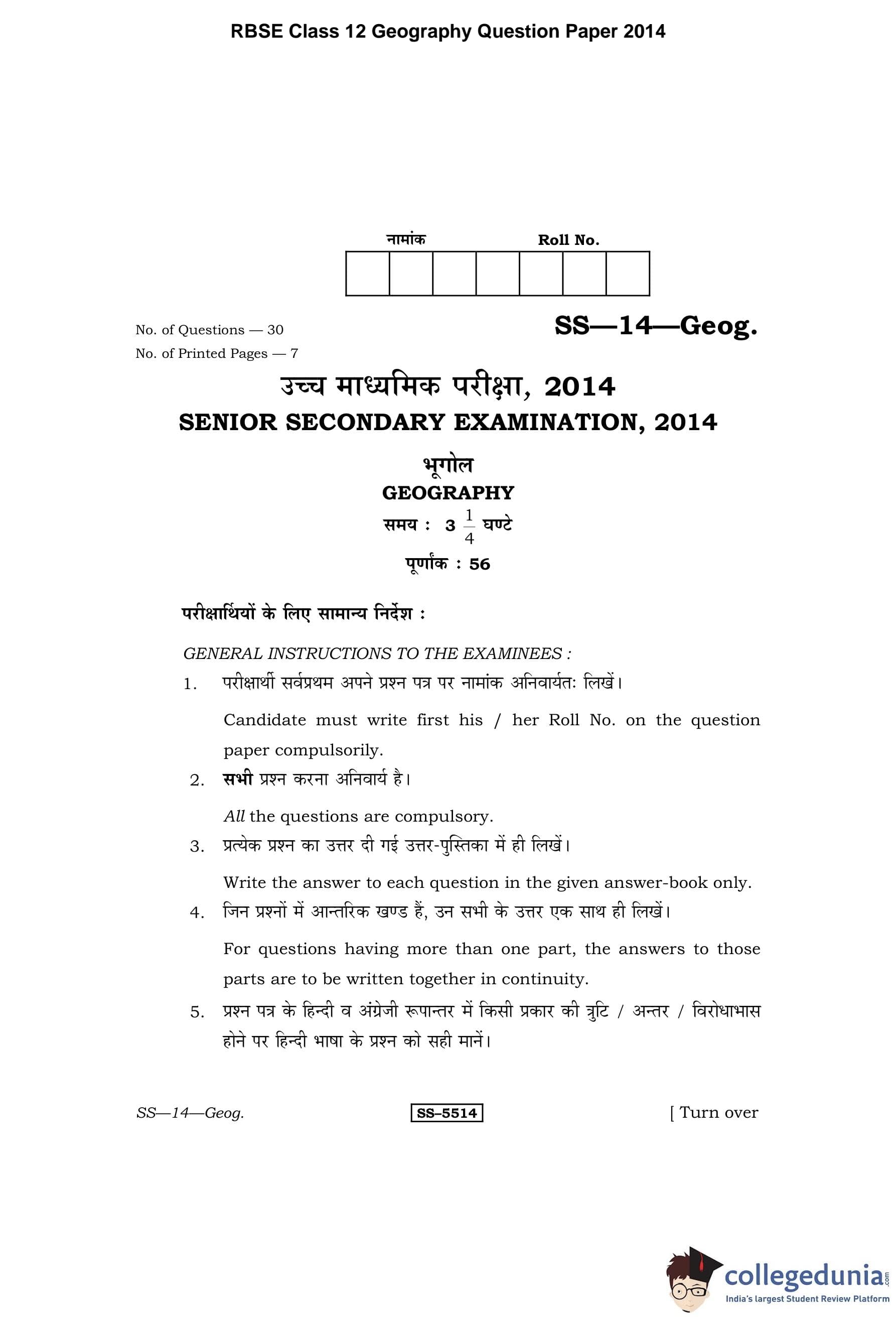 | RBSE Class 12 Geography Question Paper 2014 PDF | RBSE Class 12 Geography Answer Key 2014 PDF |