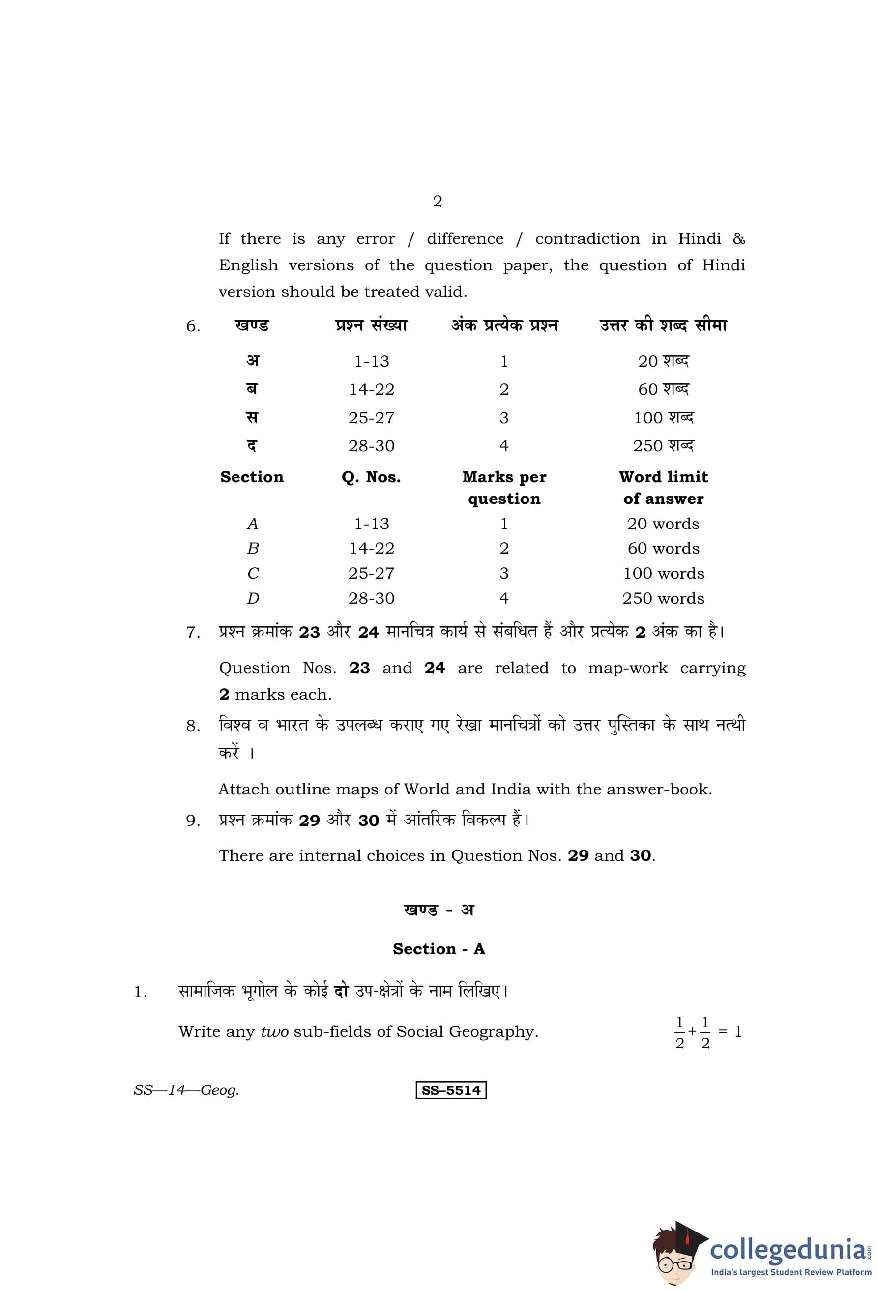 RBSE Class 12 Geography Question Paper 2014 with Answer Key pdf is available for download here. The exam was conducted by Board of Secondary Education Rajasthan (BSER) on March 25, 2014 in the Morning Session 8:30 AM to 11:45 AM. The question paper comprised a total of 30 questions divided among 4 sections.