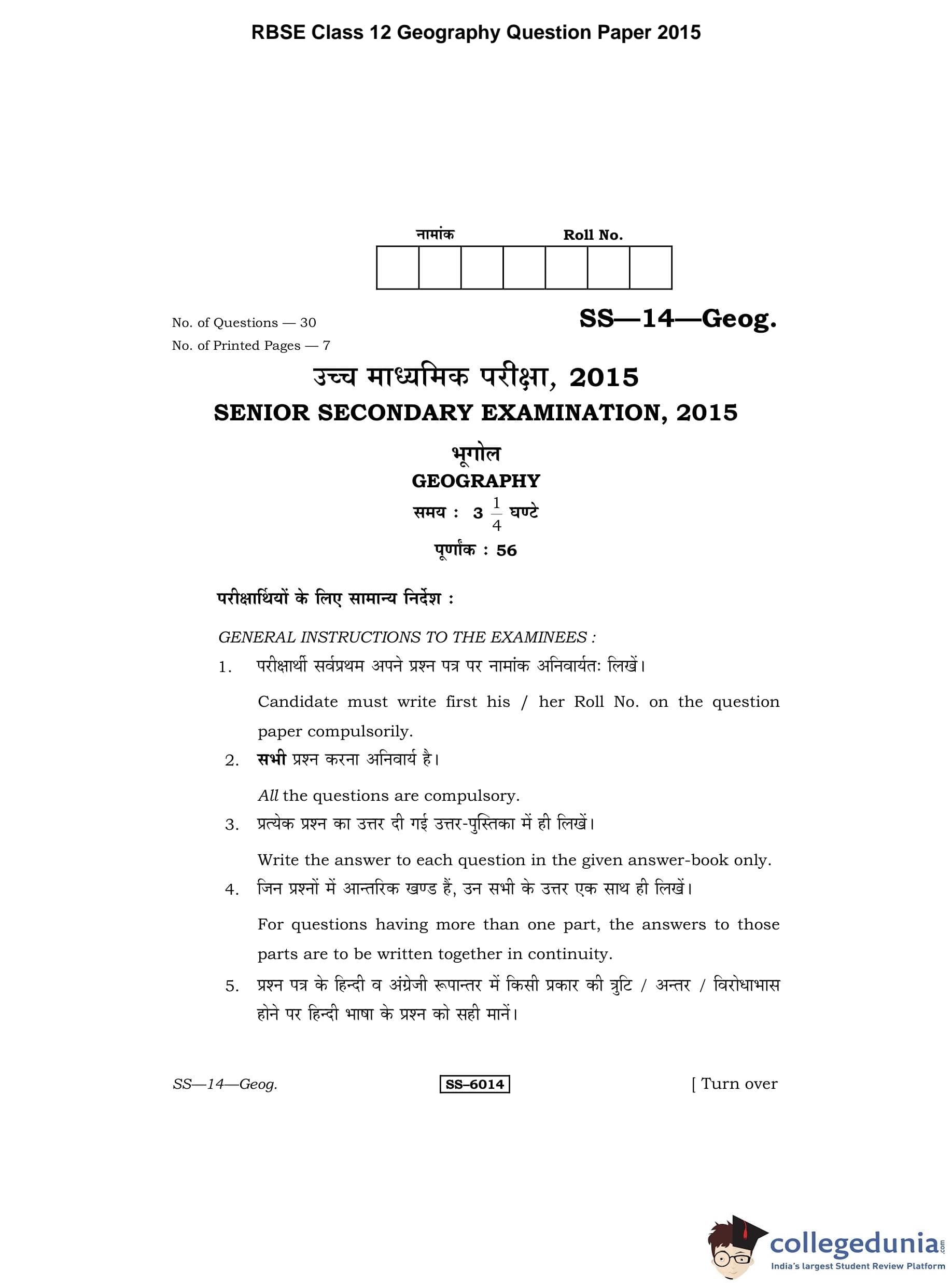 | RBSE Class 12 Geography Question Paper 2015 PDF | RBSE Class 12 Geography Answer Key 2015 PDF |