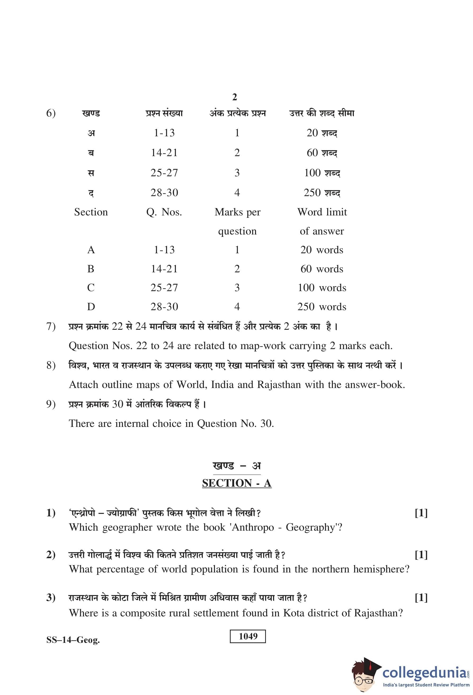 RBSE Class 12 Geography Question Paper 2018 with Answer Key pdf is available for download here. The exam was conducted by Board of Secondary Education Rajasthan (BSER) on March 14, 2018 in the Morning Session 8:30 AM to 11:45 AM. The question paper comprised a total of 30 questions divided among 4 sections.