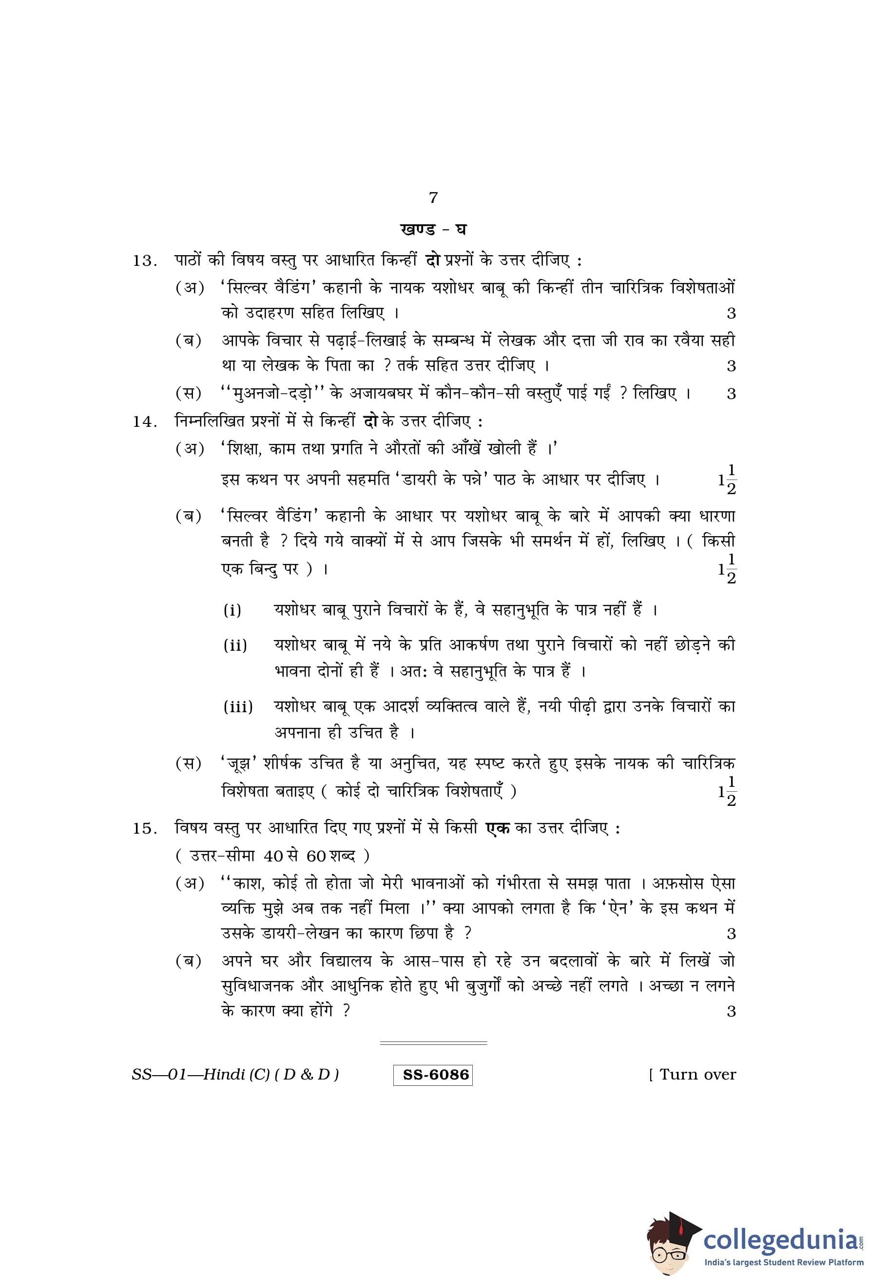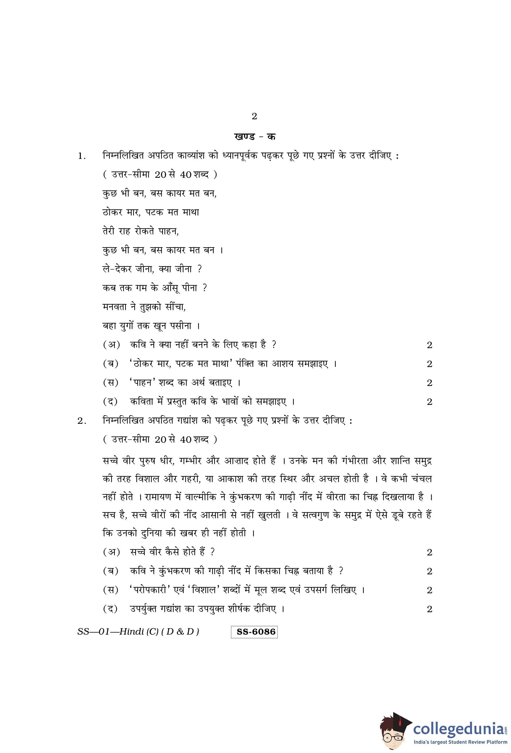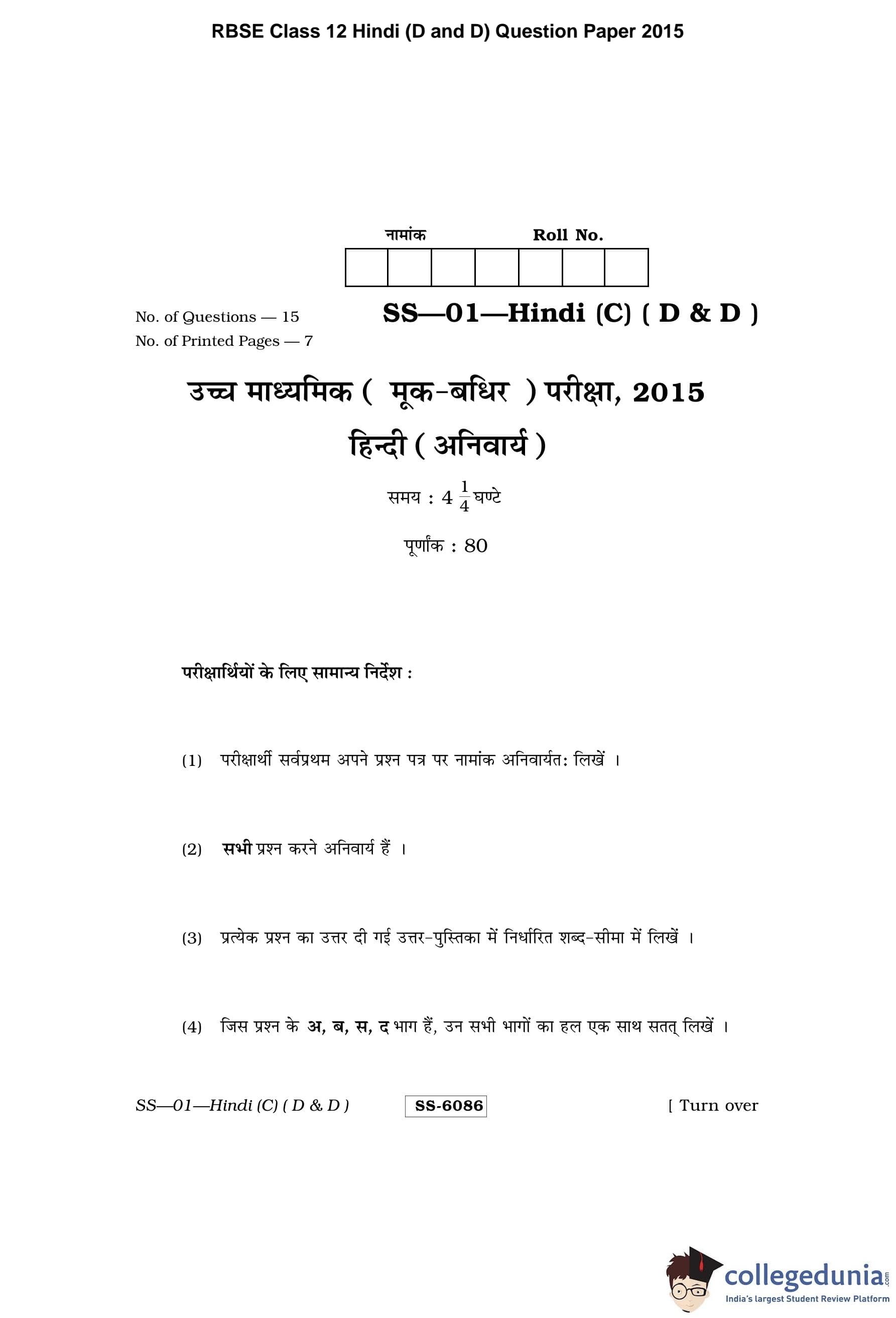 RBSE Class 12 Hindi (D and D) Question Paper 2015 with Answer Key