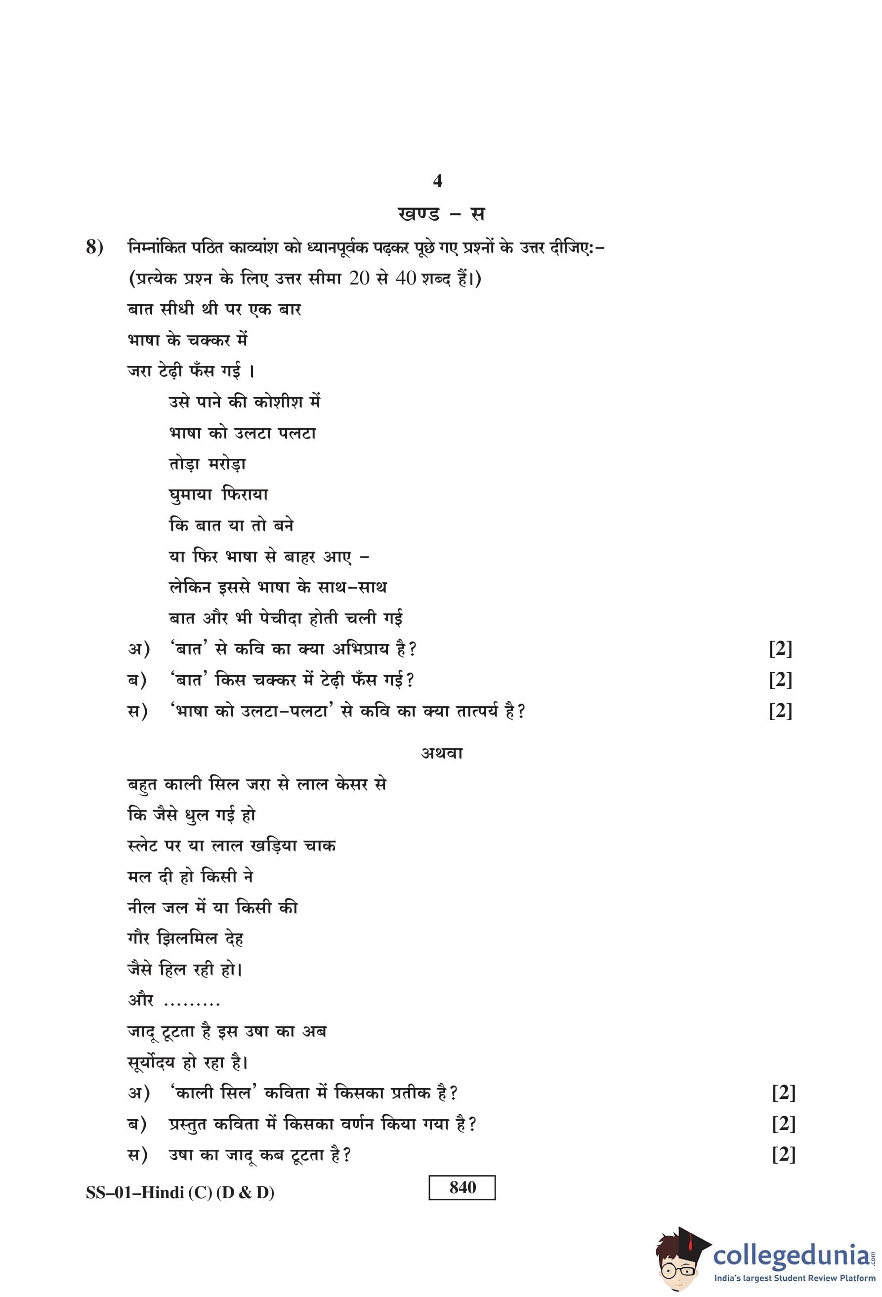 RBSE Class 12 Hindi (D and D) Question Paper 2017 with Answer Key pdf is available for download here. The exam was conducted by Board of Secondary Education Rajasthan (BSER) on March 4, 2017 in the Morning Session 8:30 AM to 11:45 AM. The question paper comprised a total of 15 questions divided among 4 sections.