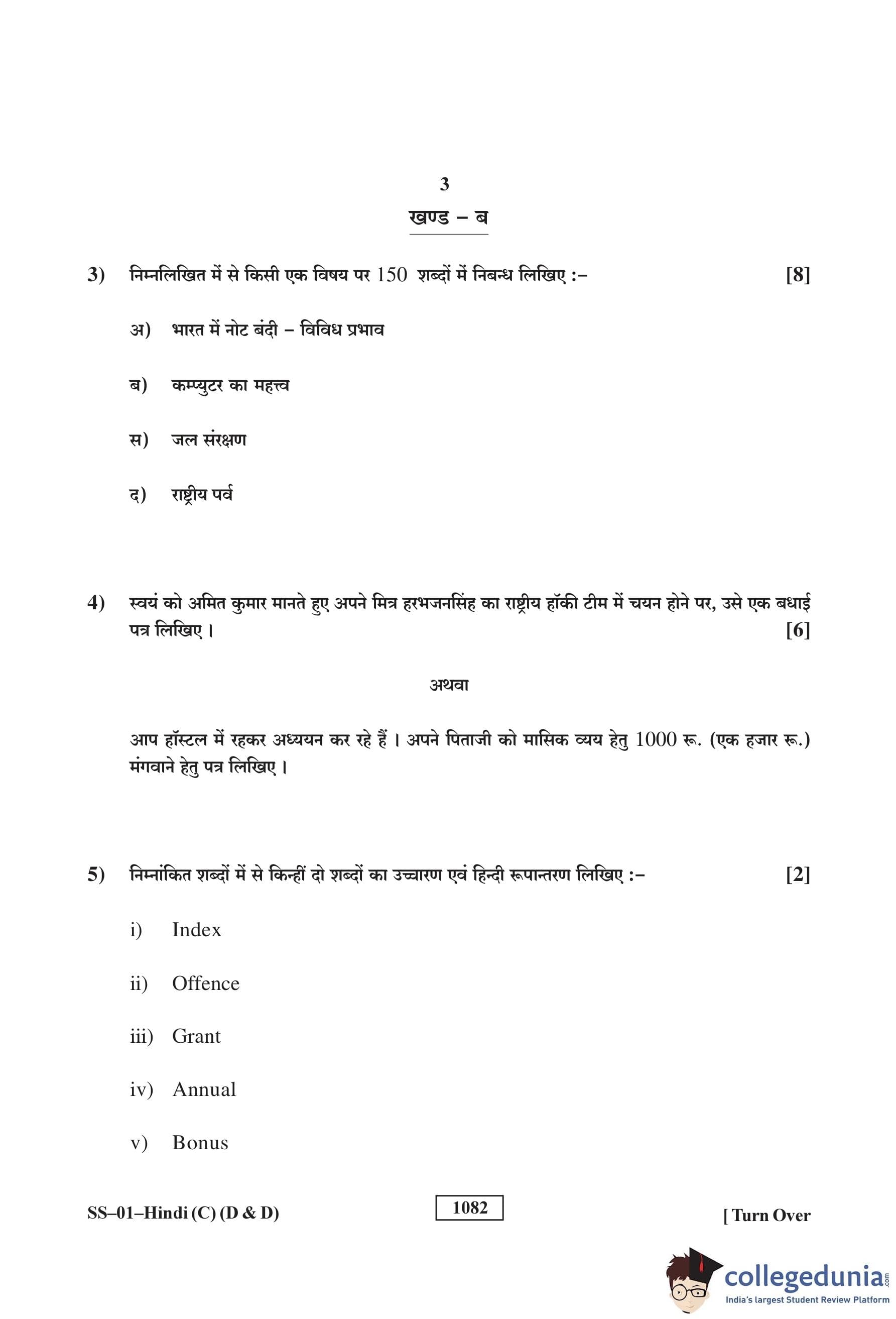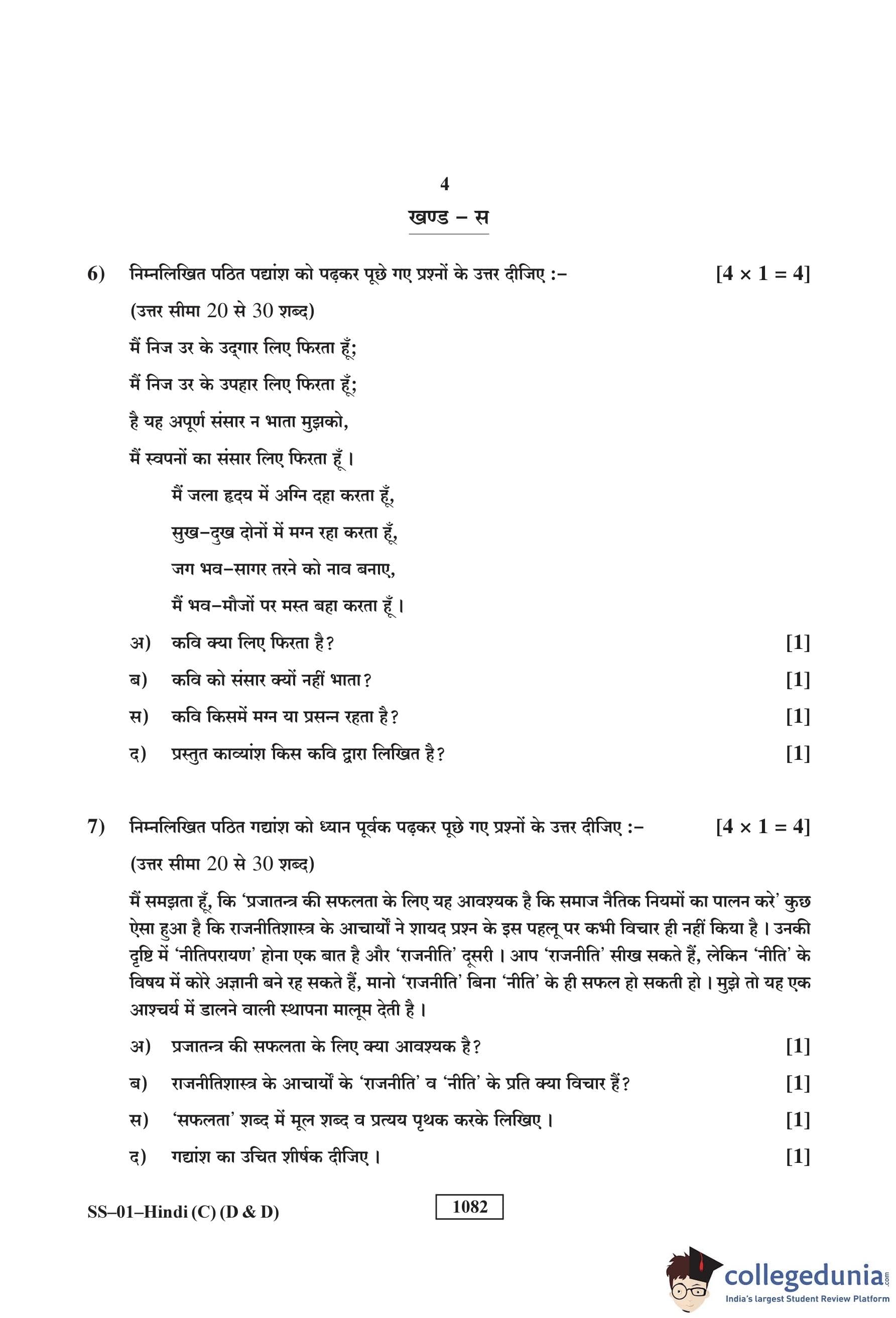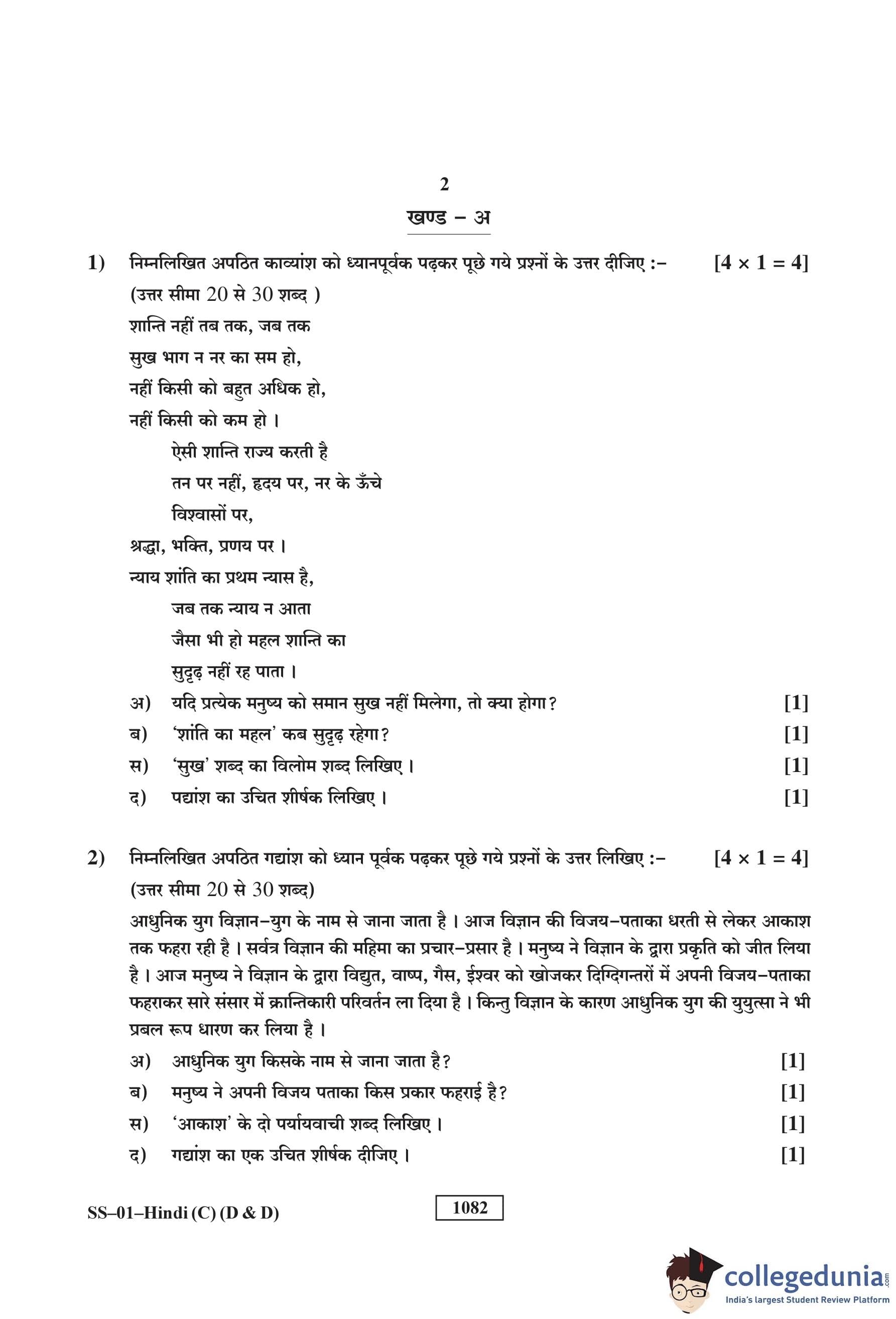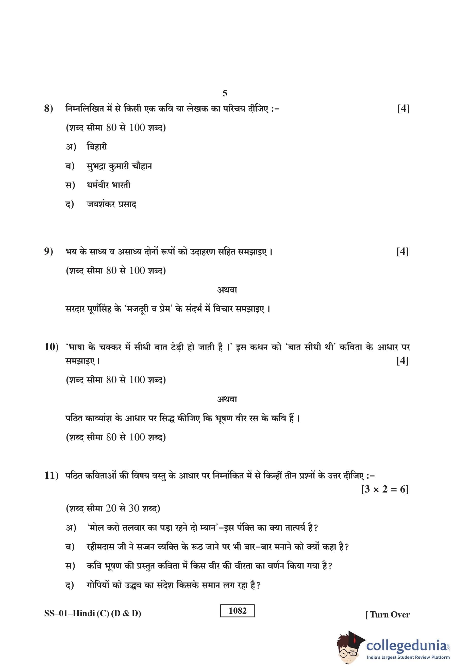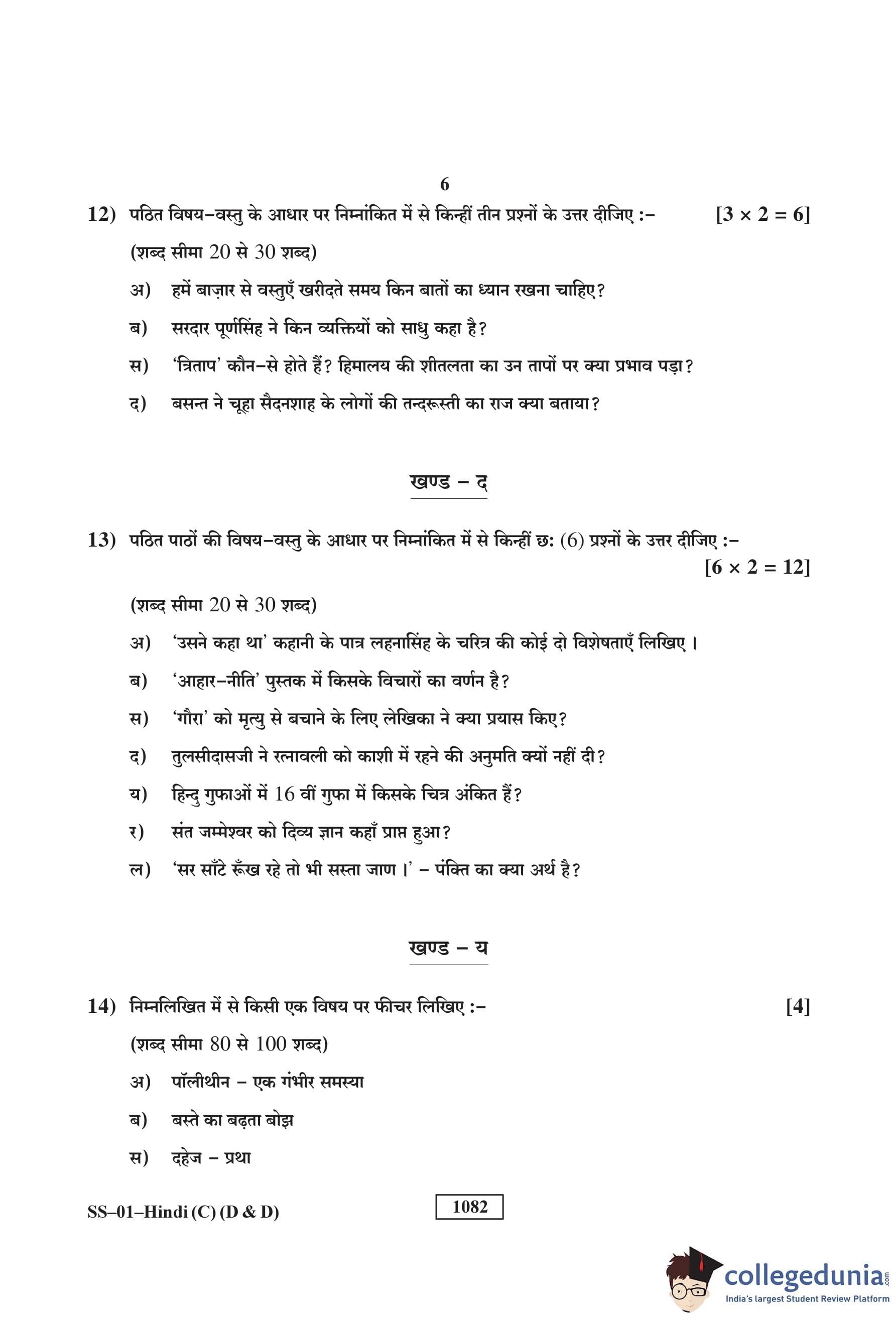 RBSE Class 12 Hindi (D and D) Question Paper 2018 with Answer Key
