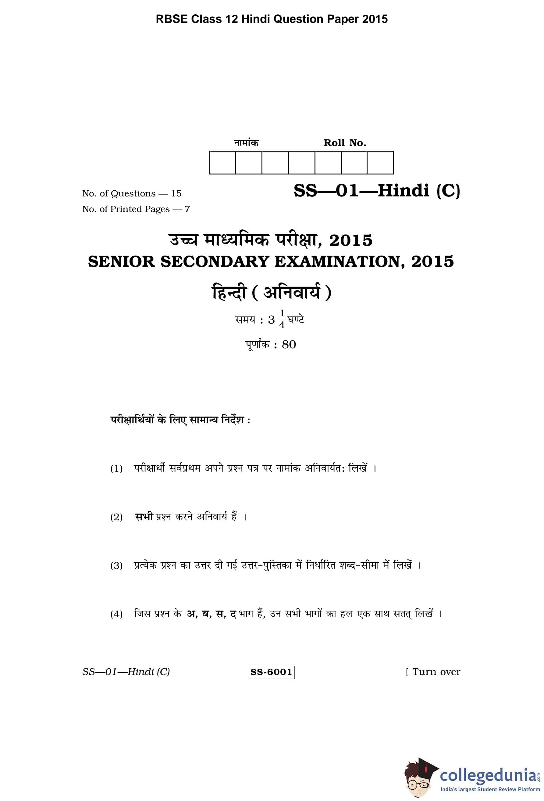 | RBSE Class 12 Hindi Question Paper 2015 PDF | RBSE Class 12 Hindi Answer Key 2015 PDF |