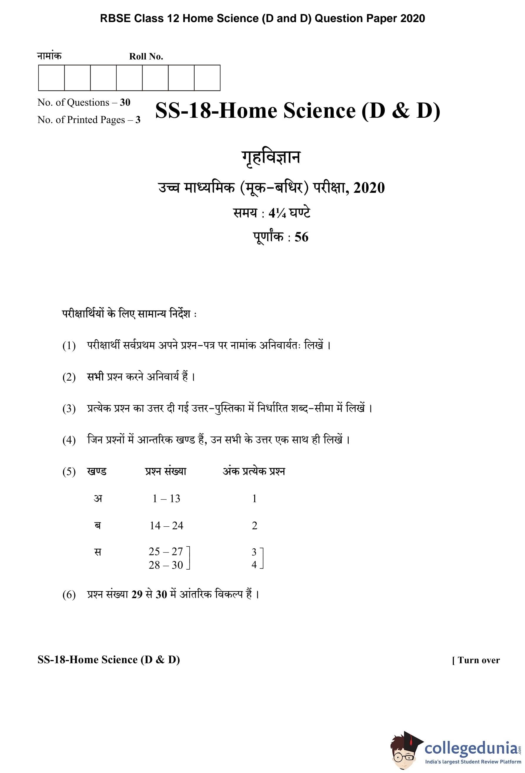 RBSE Class 12 Home Science (D and D) Question Paper 2020 with Answer Key