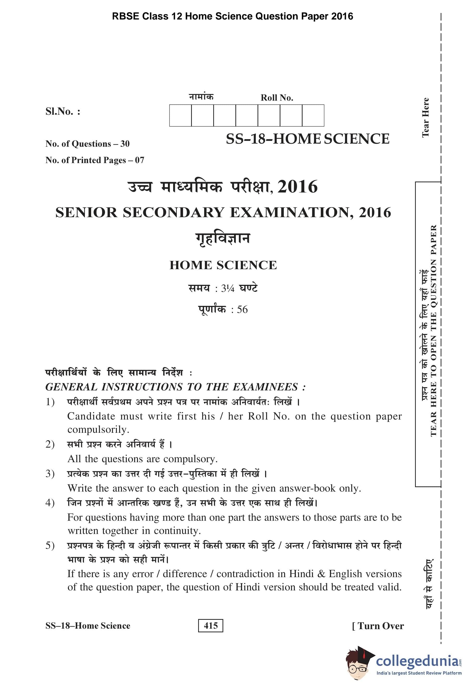 | RBSE Class 12 Home Science Question Paper 2016 PDF | RBSE Class 12 Home Science Answer Key 2016 PDF |