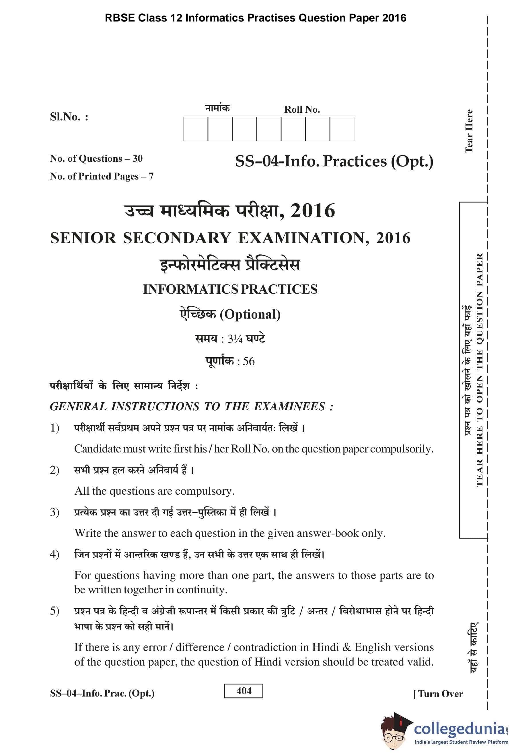 | RBSE Class 12 Informatics Practises Question Paper 2016 PDF | RBSE Class 12 Informatics Practises Answer Key 2016 PDF |