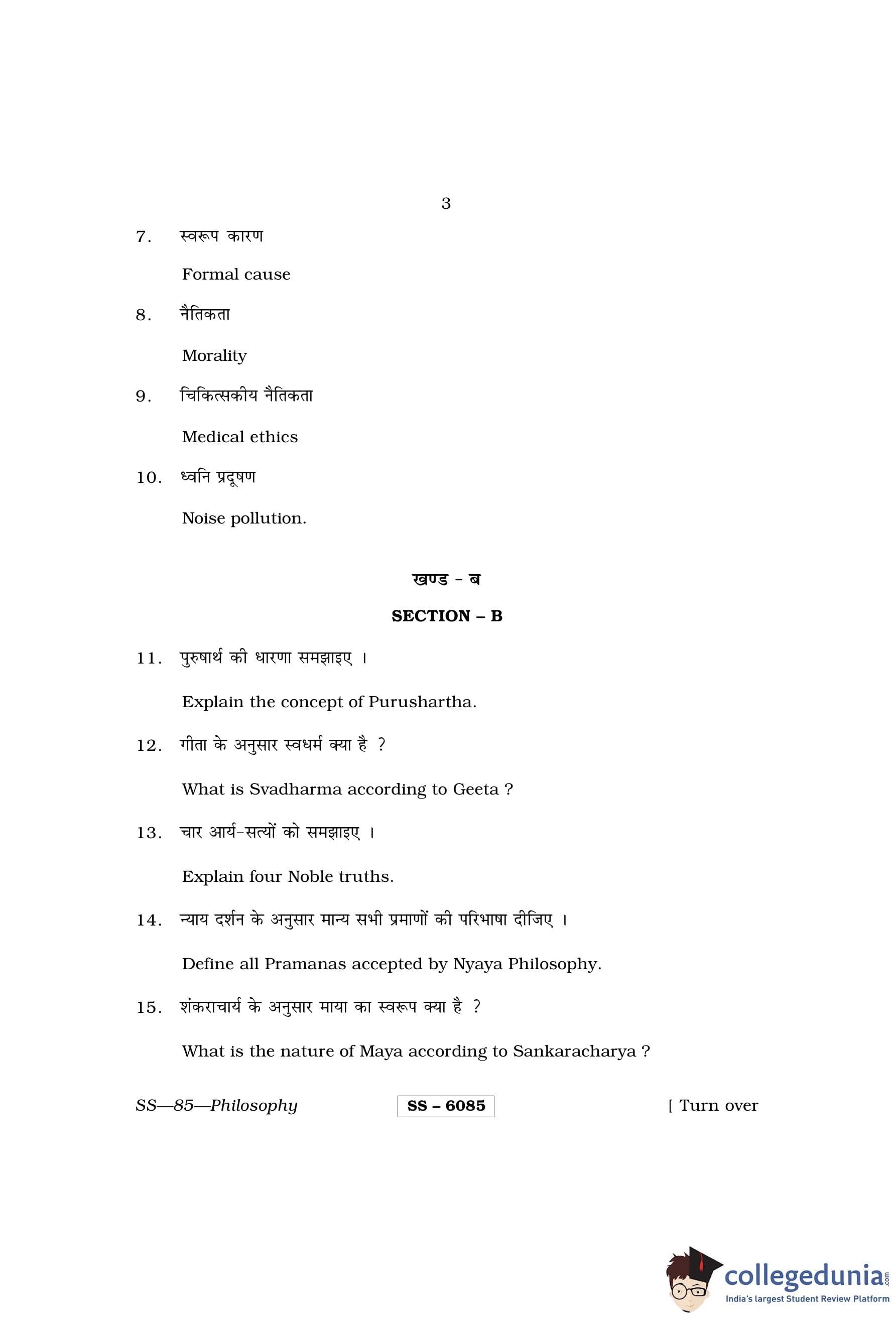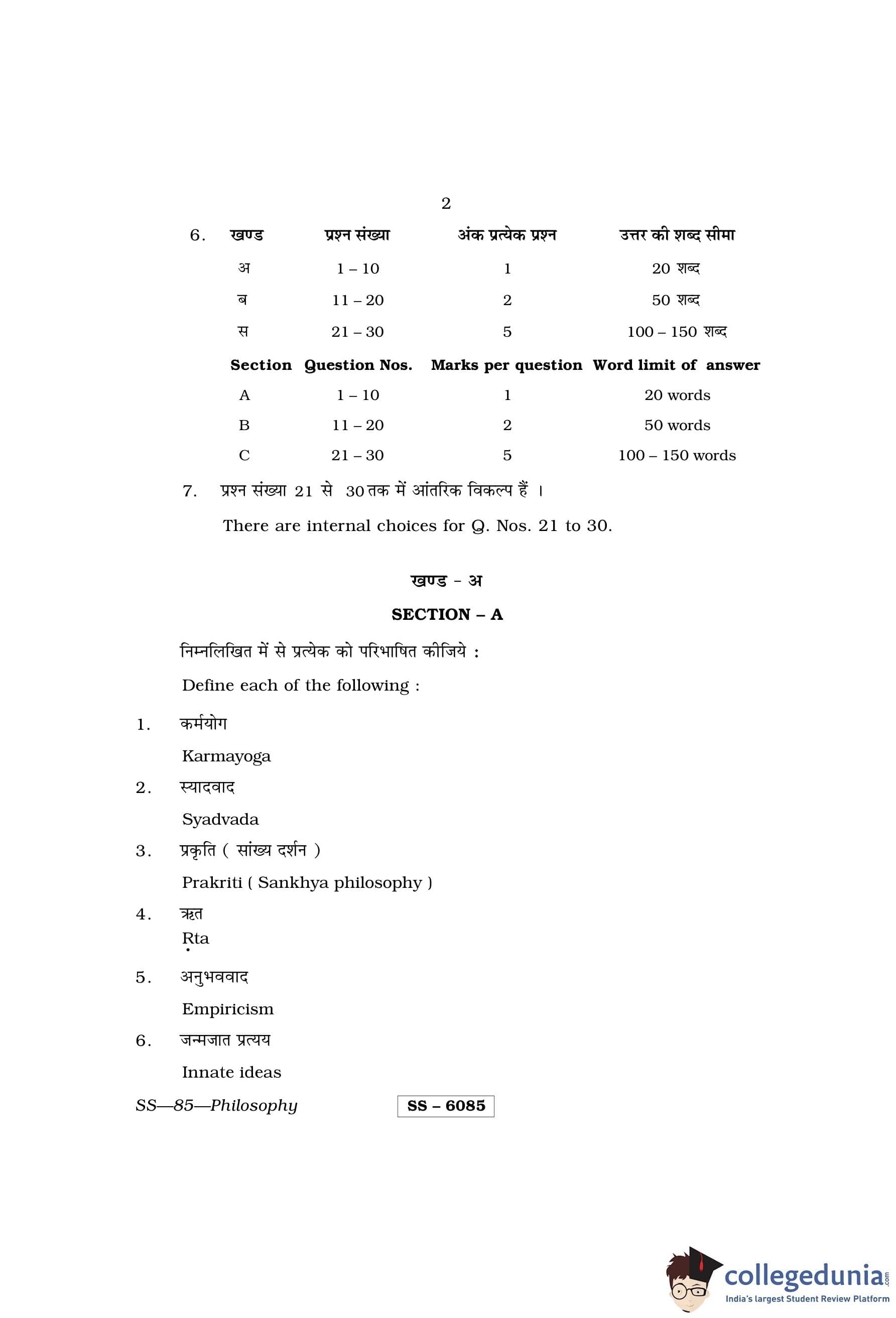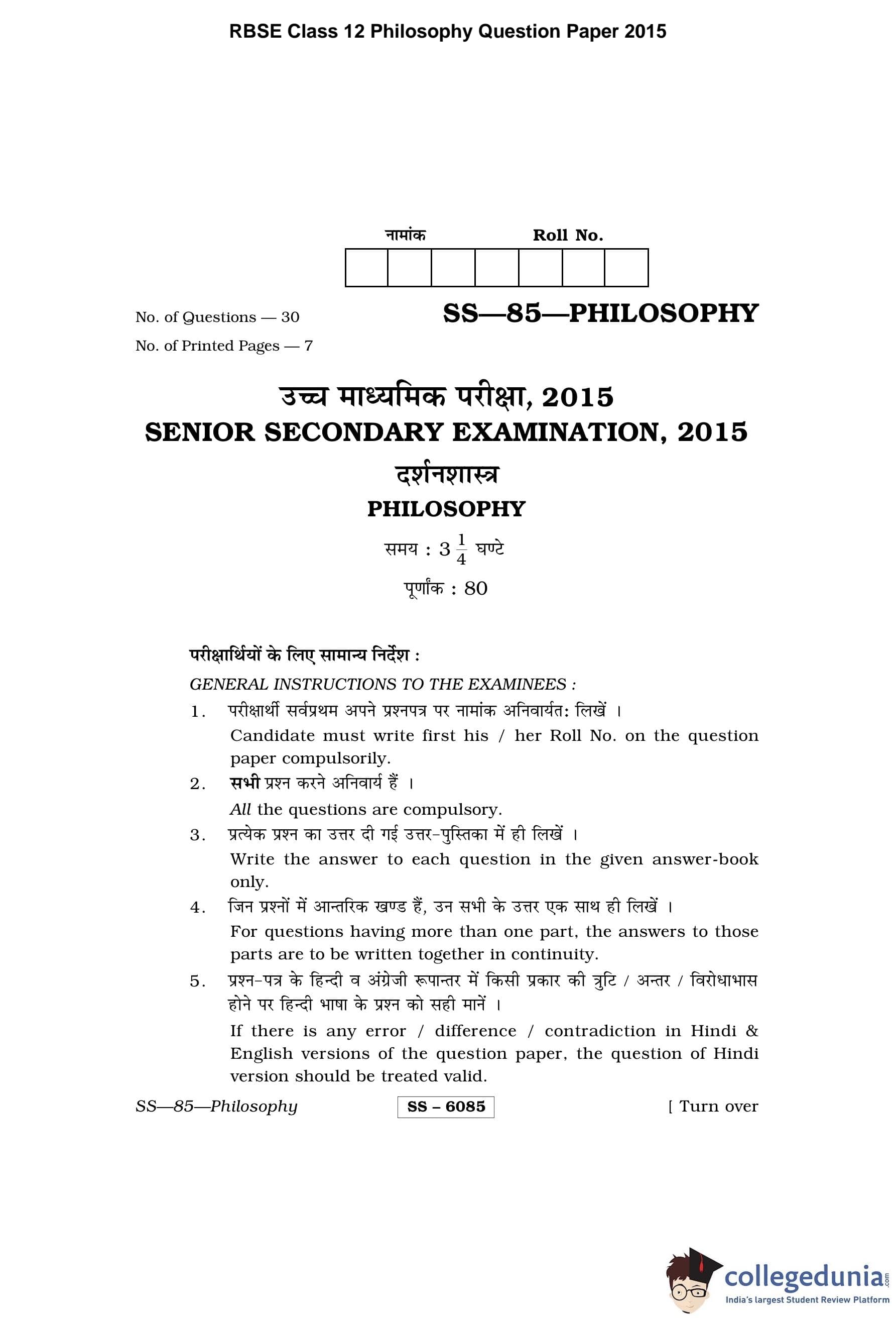 RBSE Class 12 Philosophy Question Paper 2015 with Answer Key pdf is available for download here. The exam was conducted by Board of Secondary Education Rajasthan (BSER) on March 25, 2015 in the Morning Session 8:30 AM to 11:45 AM. The question paper comprised a total of 30 questions divided among 3 sections.