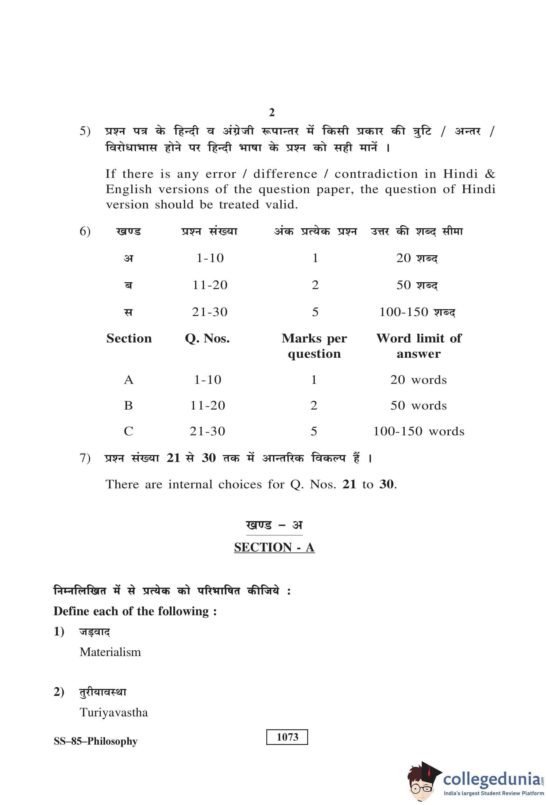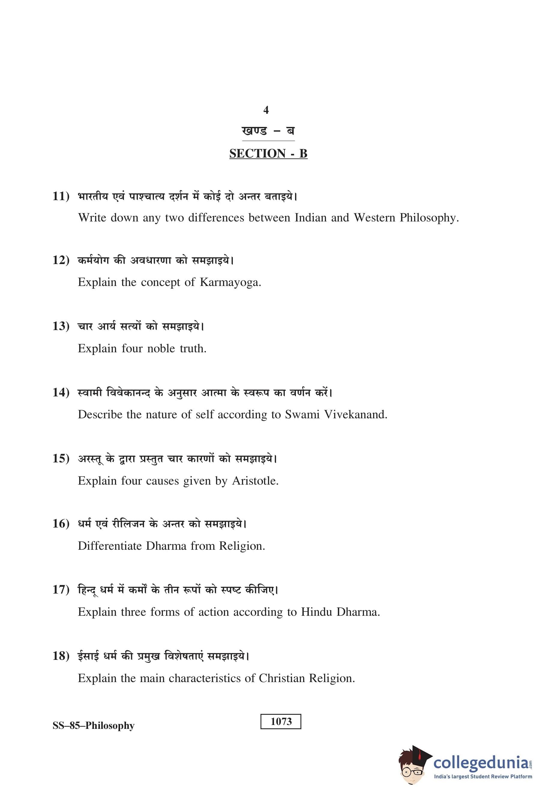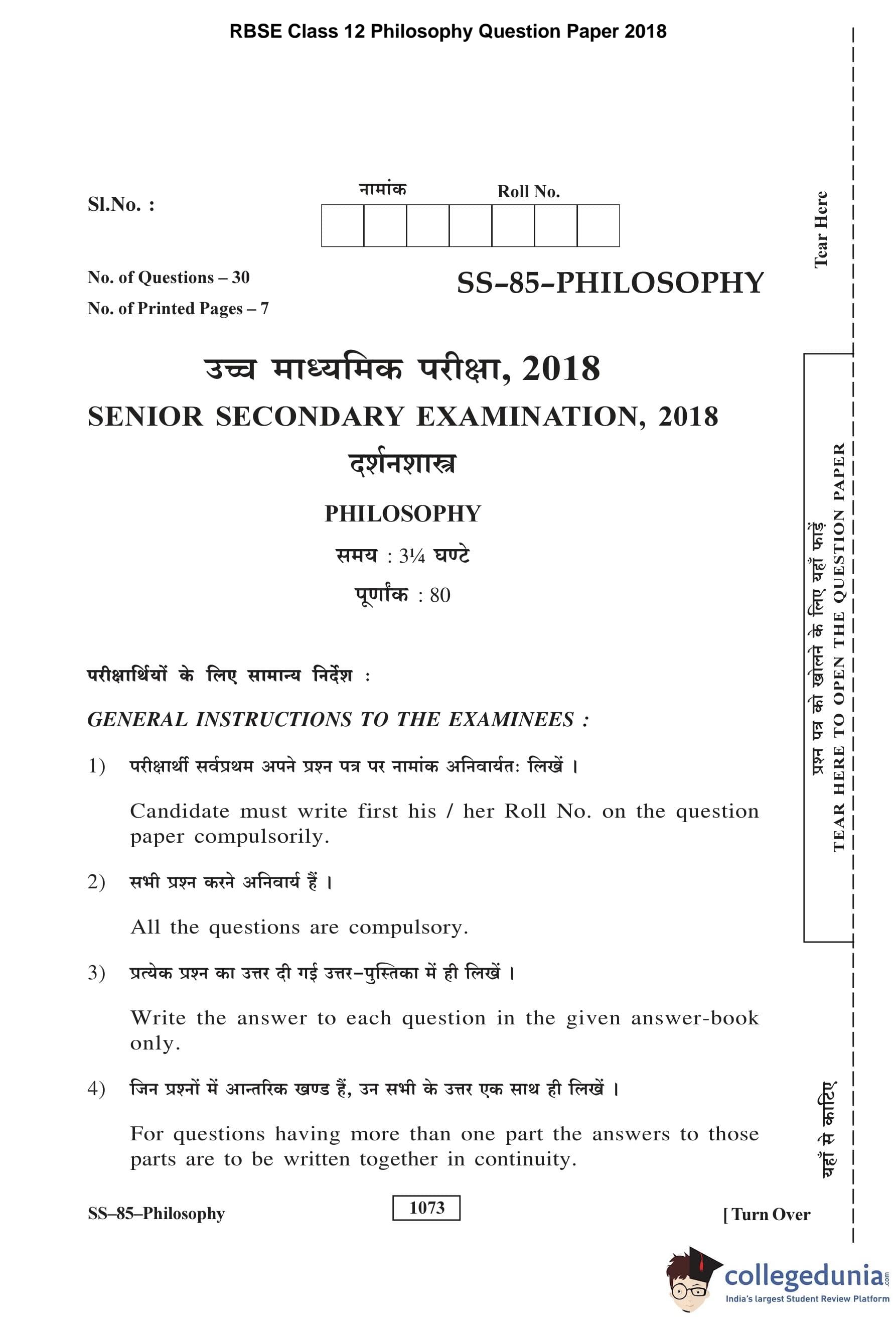 RBSE Class 12 Philosophy Question Paper 2018 with Answer Key pdf is available for download here. The exam was conducted by Board of Secondary Education Rajasthan (BSER) on March 26, 2018 in the Morning Session 8:30 AM to 11:45 AM. The question paper comprised a total of 30 questions divided among 3 sections.