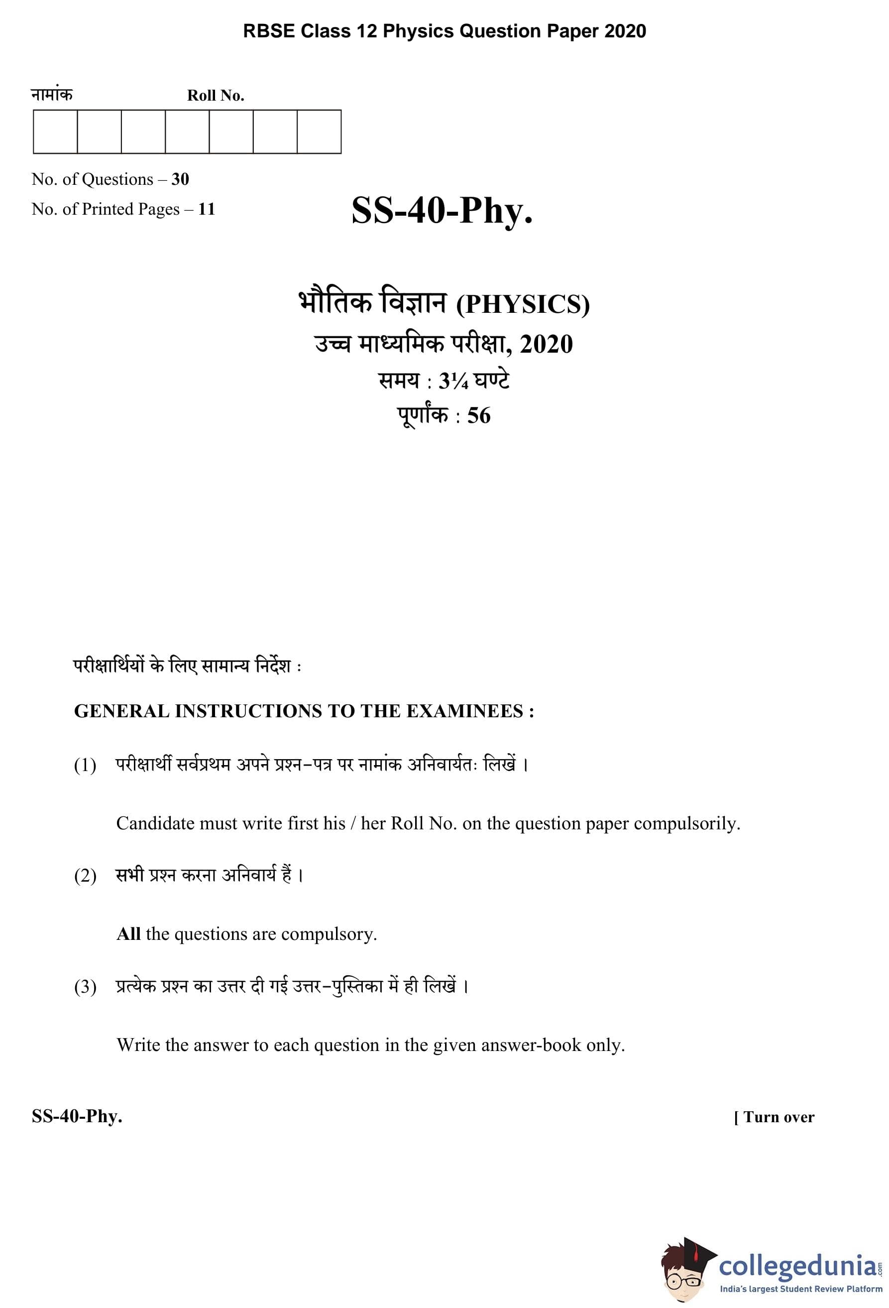 | RBSE Class 12 Physics Question Paper 2020 PDF | RBSE Class 12 Physics Answer Key 2020 PDF |