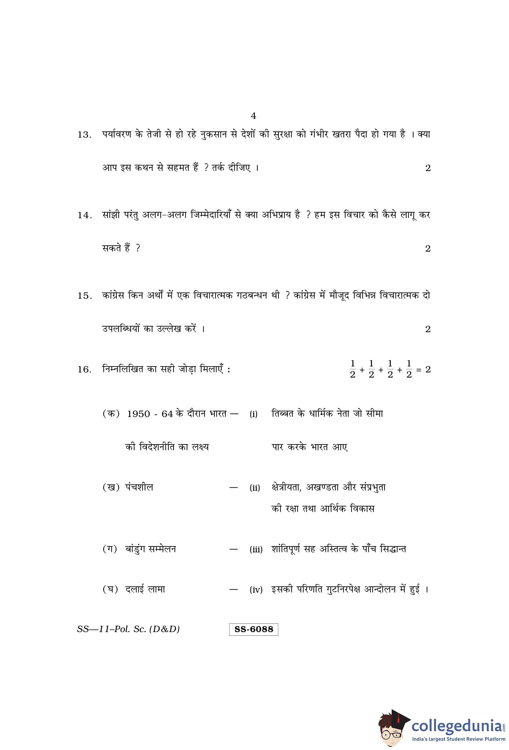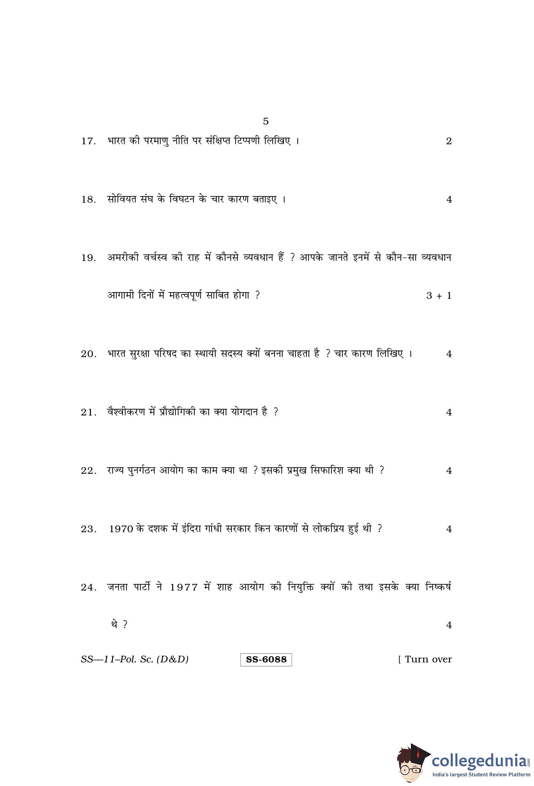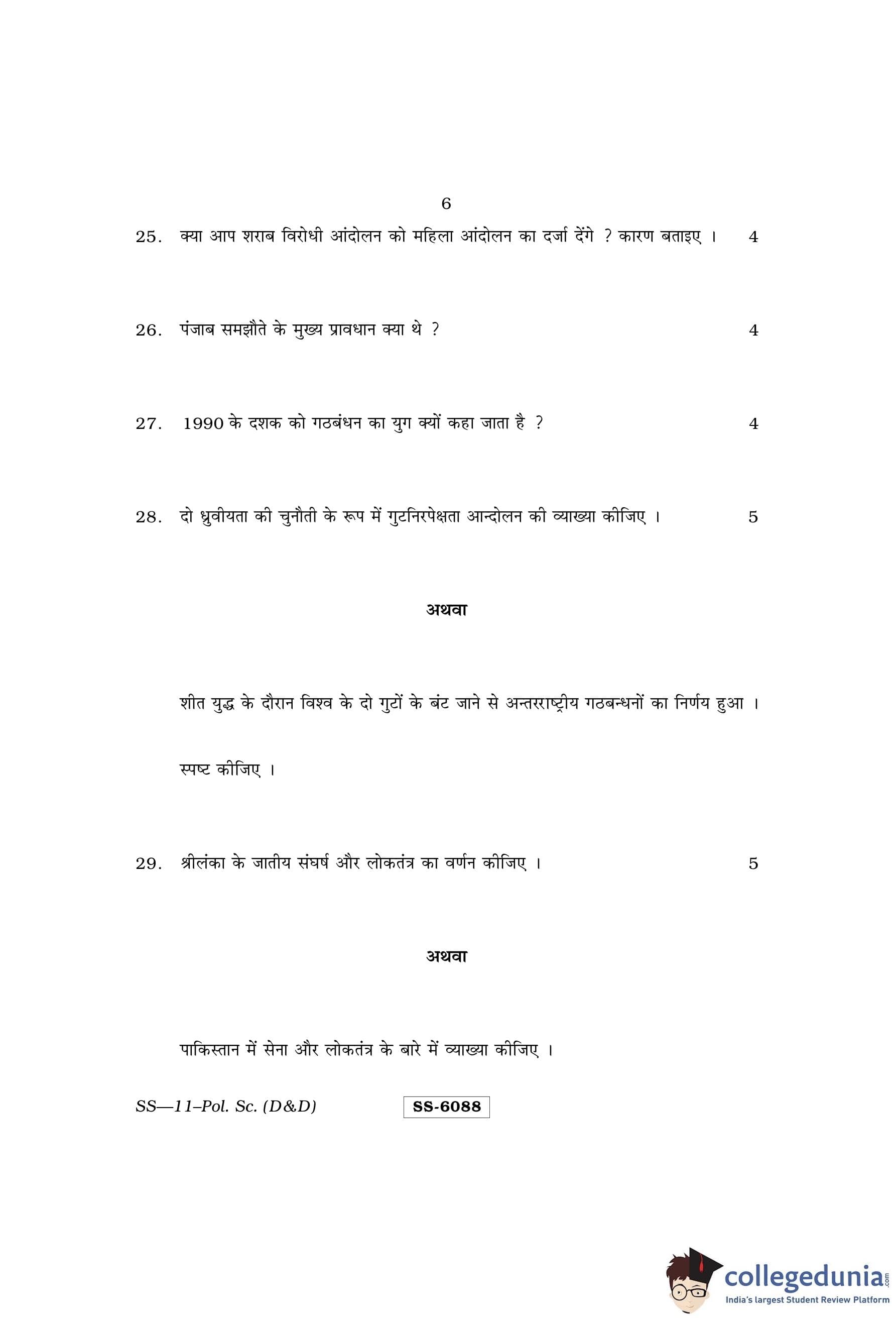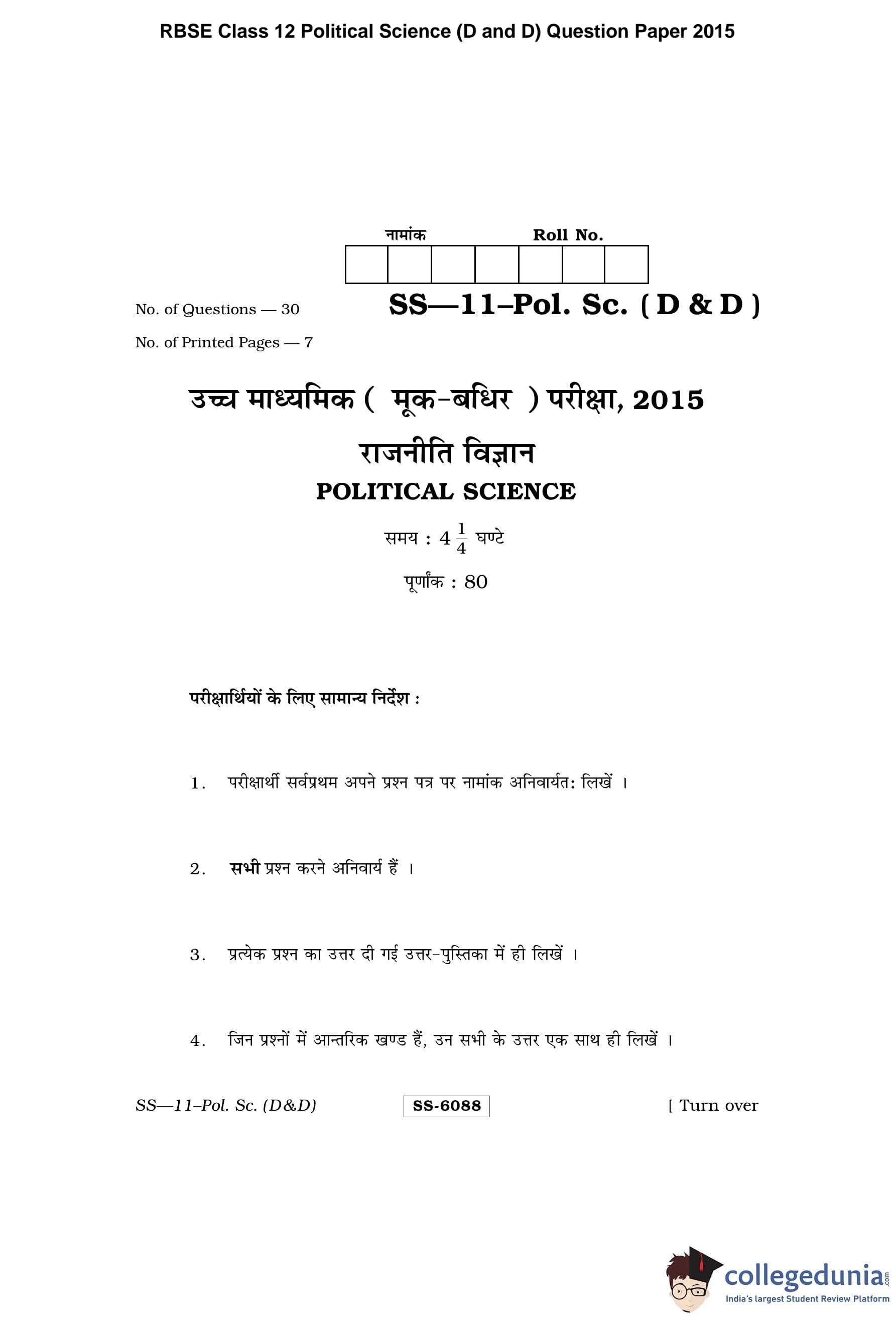 RBSE Class 12 Political Science (D and D) Question Paper 2015 with Answer Key pdf is available for download here. The exam was conducted by Board of Secondary Education Rajasthan (BSER) on March 16, 2015 in the Morning Session 8:30 AM to 11:45 AM. The question paper comprised a total of 30 questions.