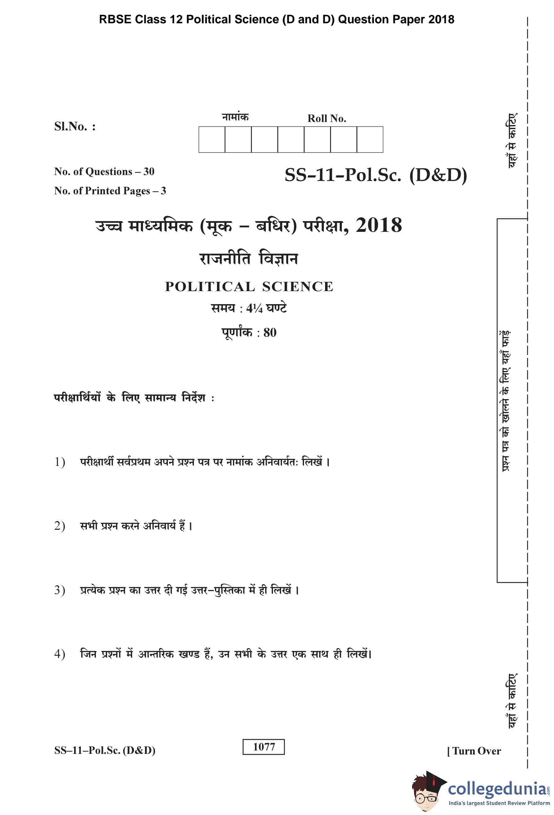RBSE Class 12 Political Science (D and D) Question Paper 2018 with Answer Key
