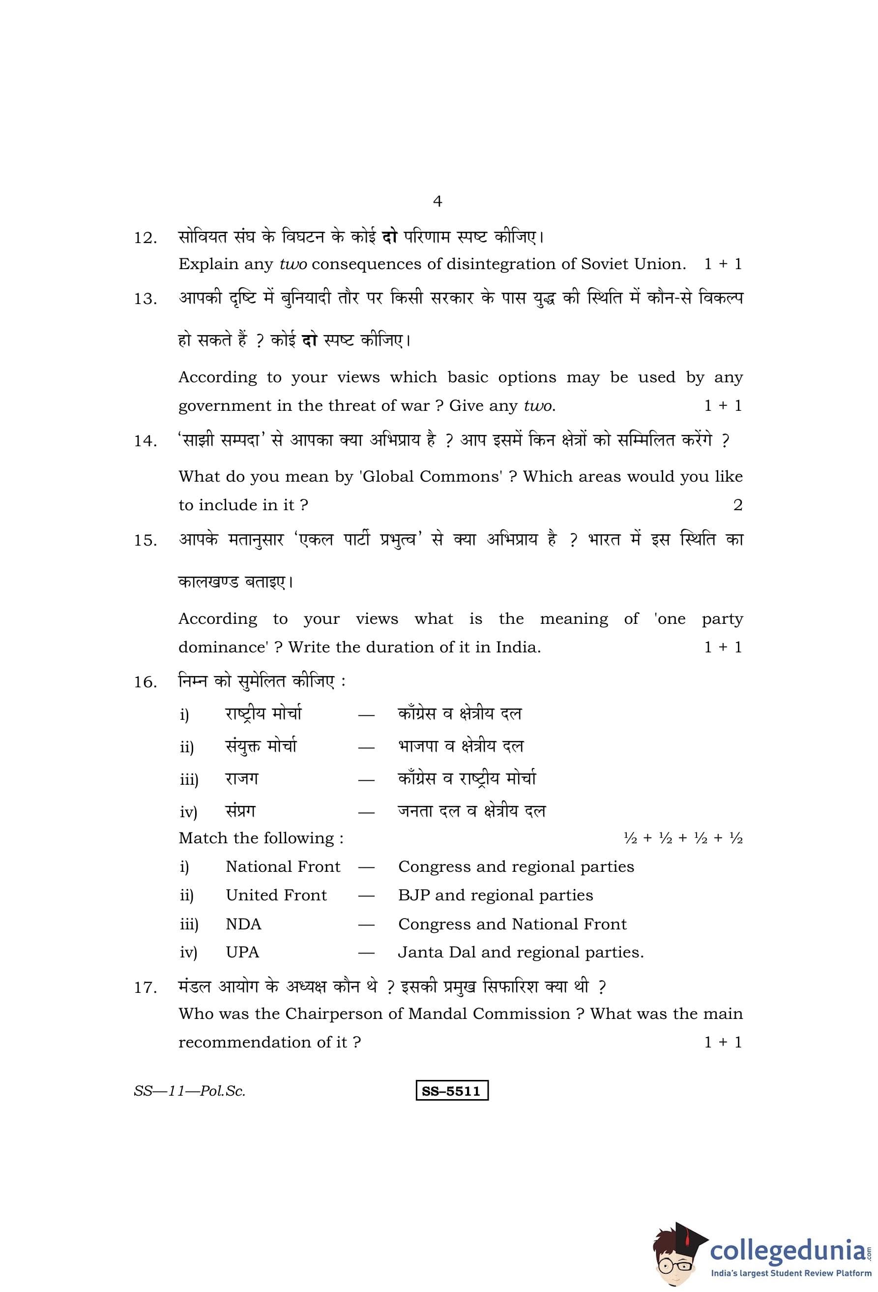 RBSE Class 12 Political Science Question Paper 2014 with Answer Key