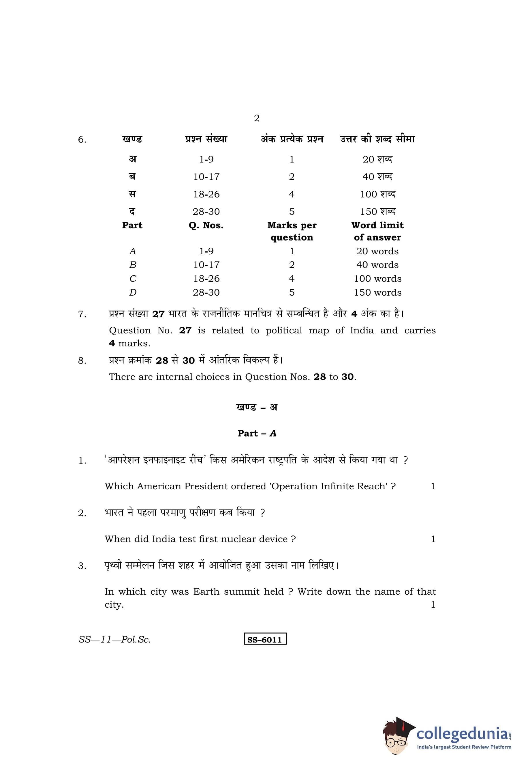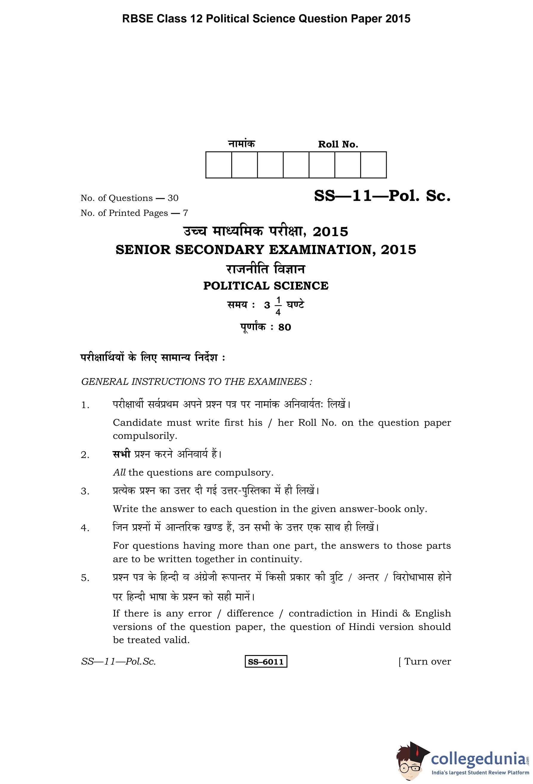 RBSE Class 12 Political Science Question Paper 2015 with Answer Key pdf is available for download here. The exam was conducted by Board of Secondary Education Rajasthan (BSER) on March 16, 2015 in the Morning Session 8:30 AM to 11:45 AM. The question paper comprised a total of 30 questions divided among 4 sections.