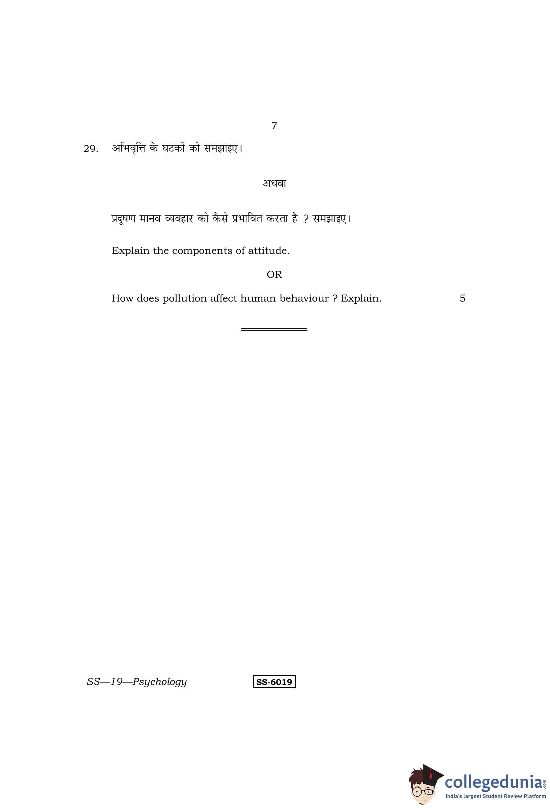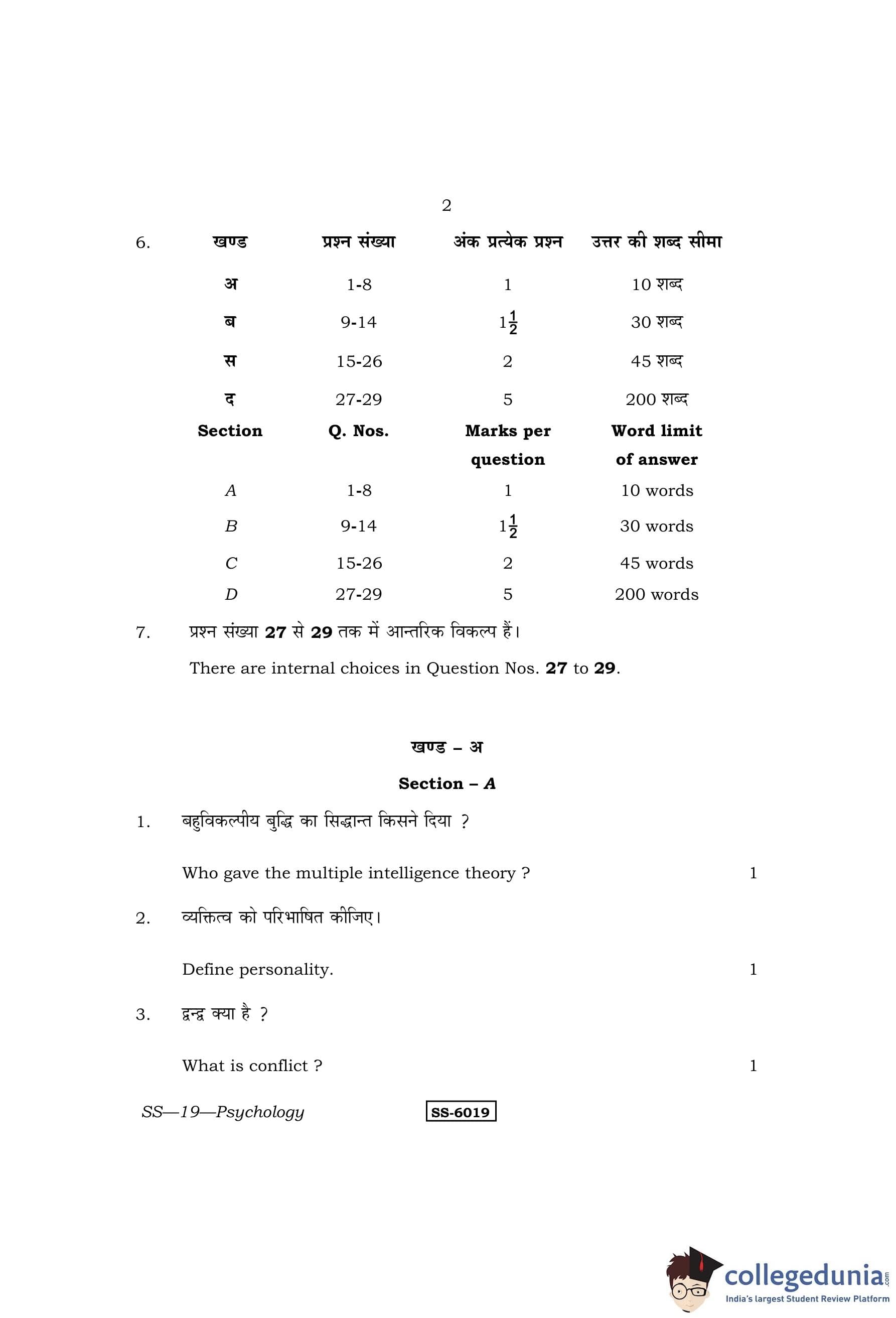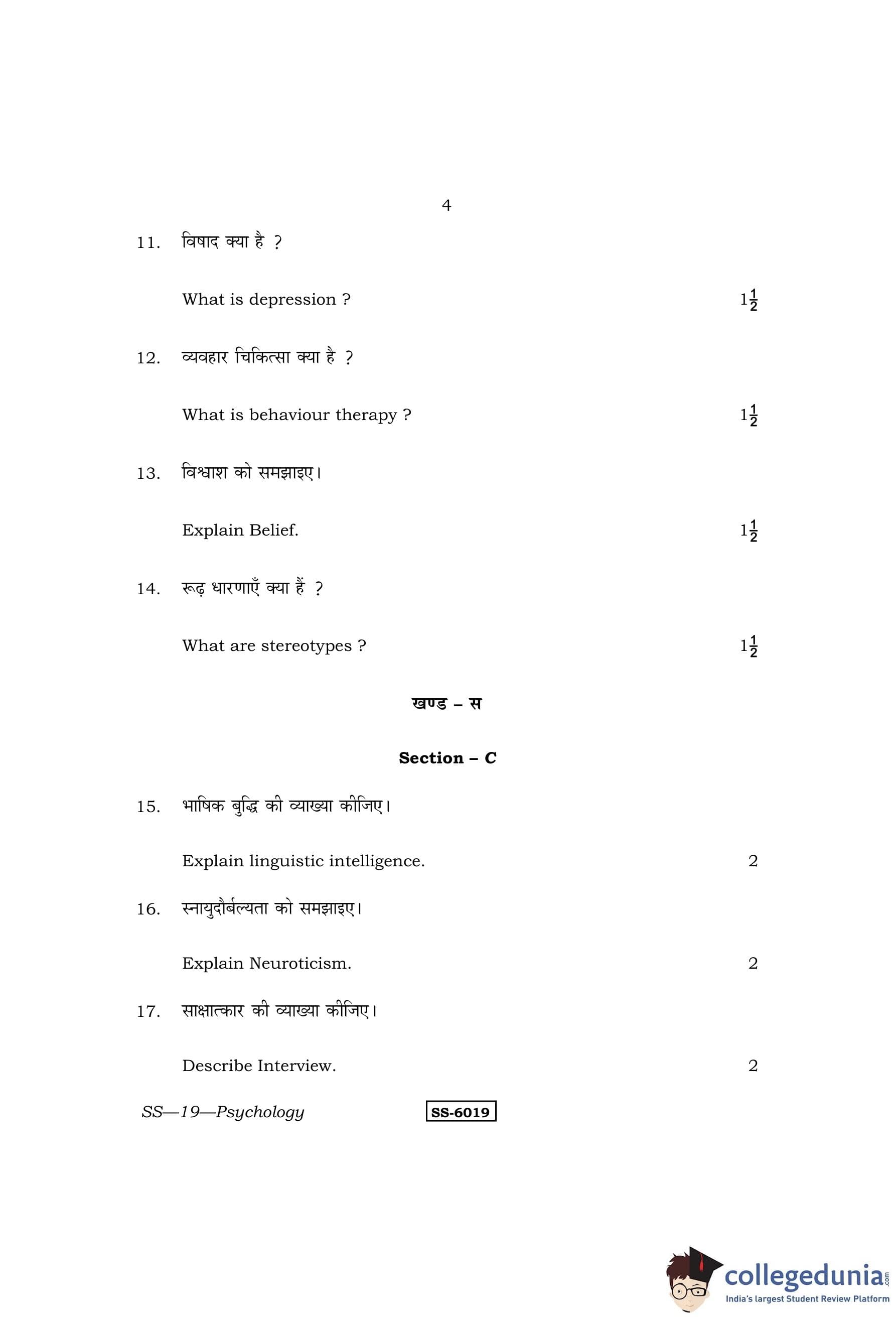 RBSE Class 12 Psychology Question Paper 2015 with Answer Key pdf is available for download here. The exam was conducted by Board of Secondary Education Rajasthan (BSER) on March 27, 2015 in the Morning Session 8:30 AM to 11:45 AM. The question paper comprised a total of 29 questions divided among 4 sections.