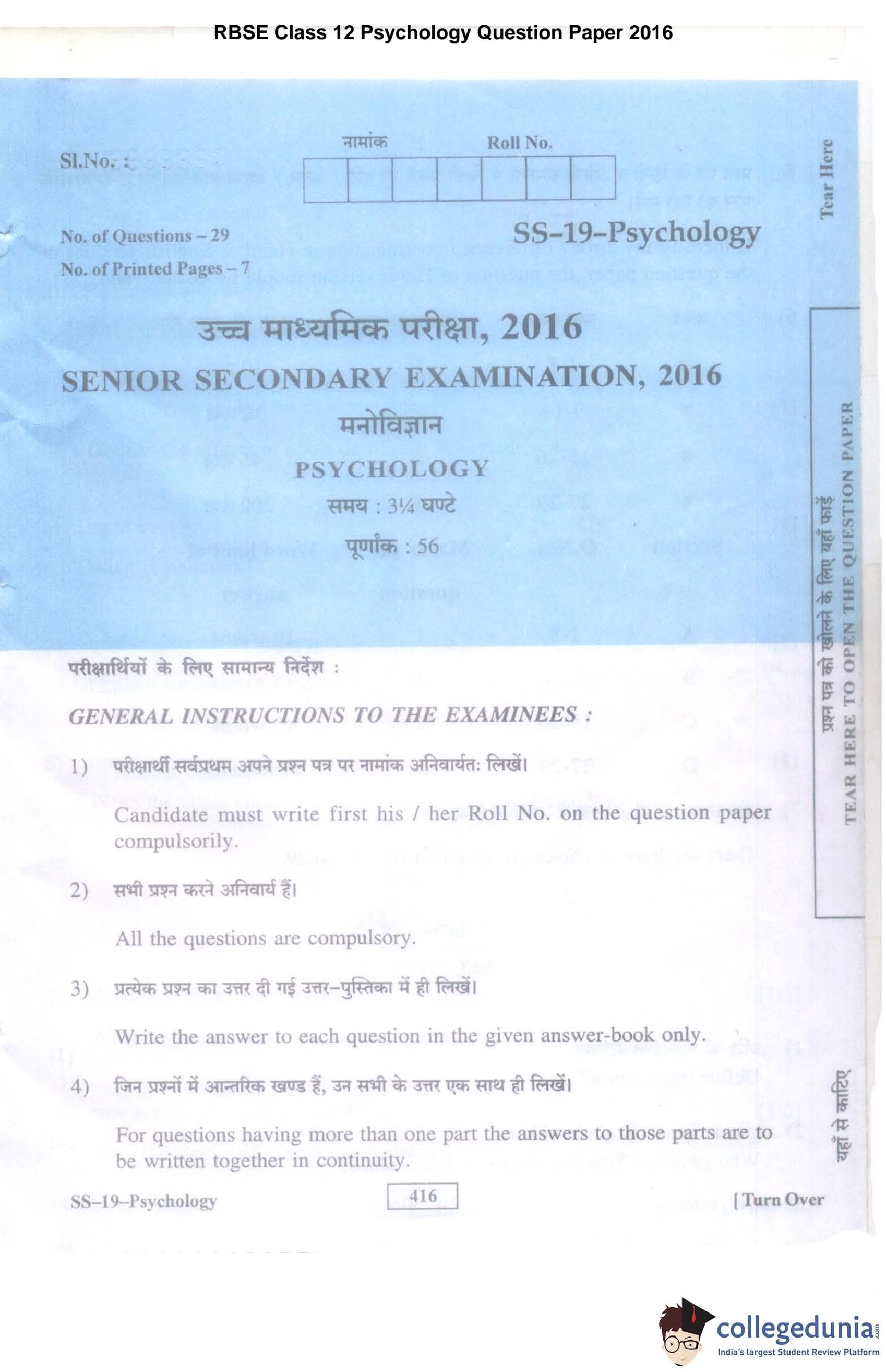 | RBSE Class 12 Psychology Question Paper 2016 PDF | RBSE Class 12 Psychology Answer Key 2016 PDF |