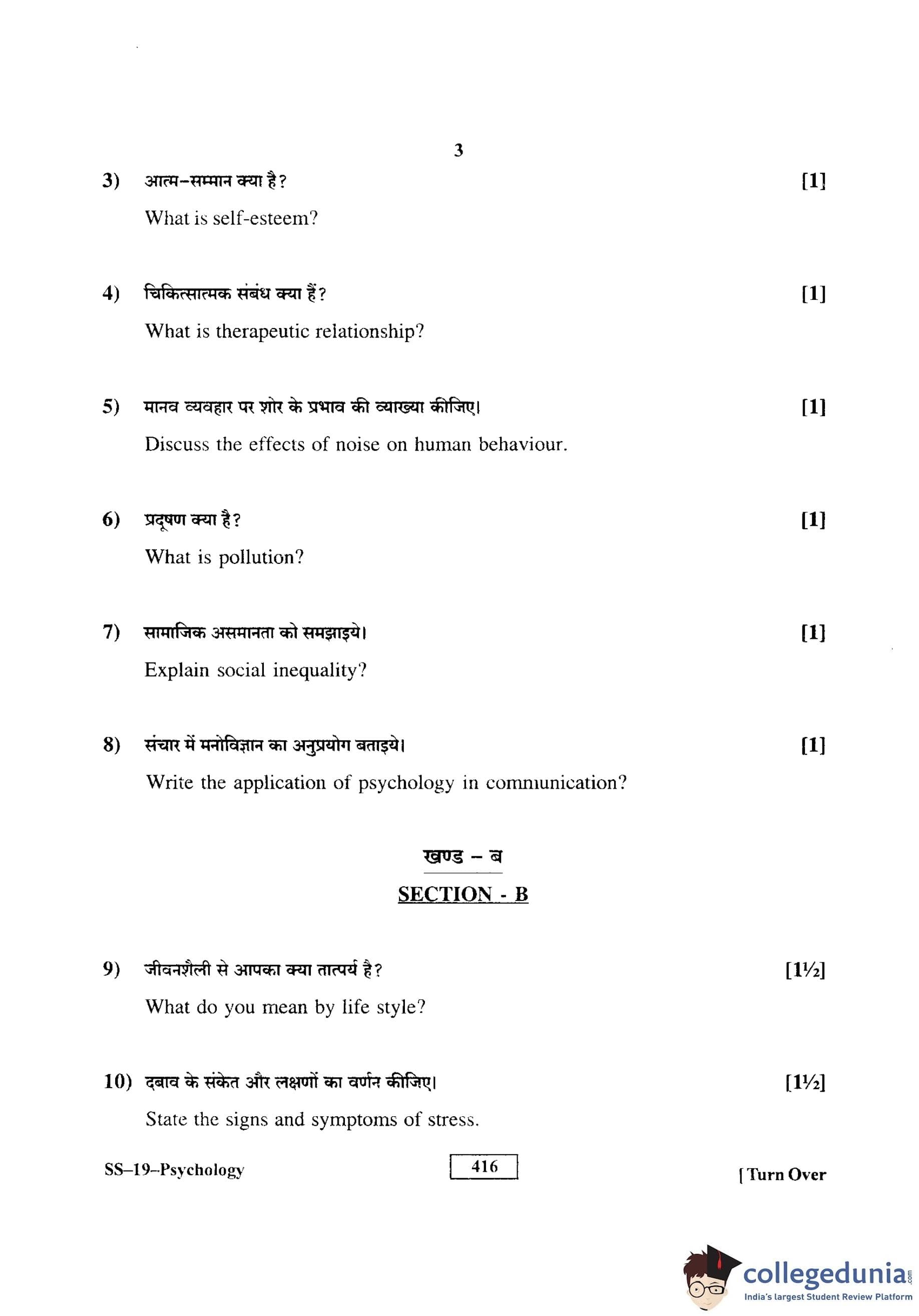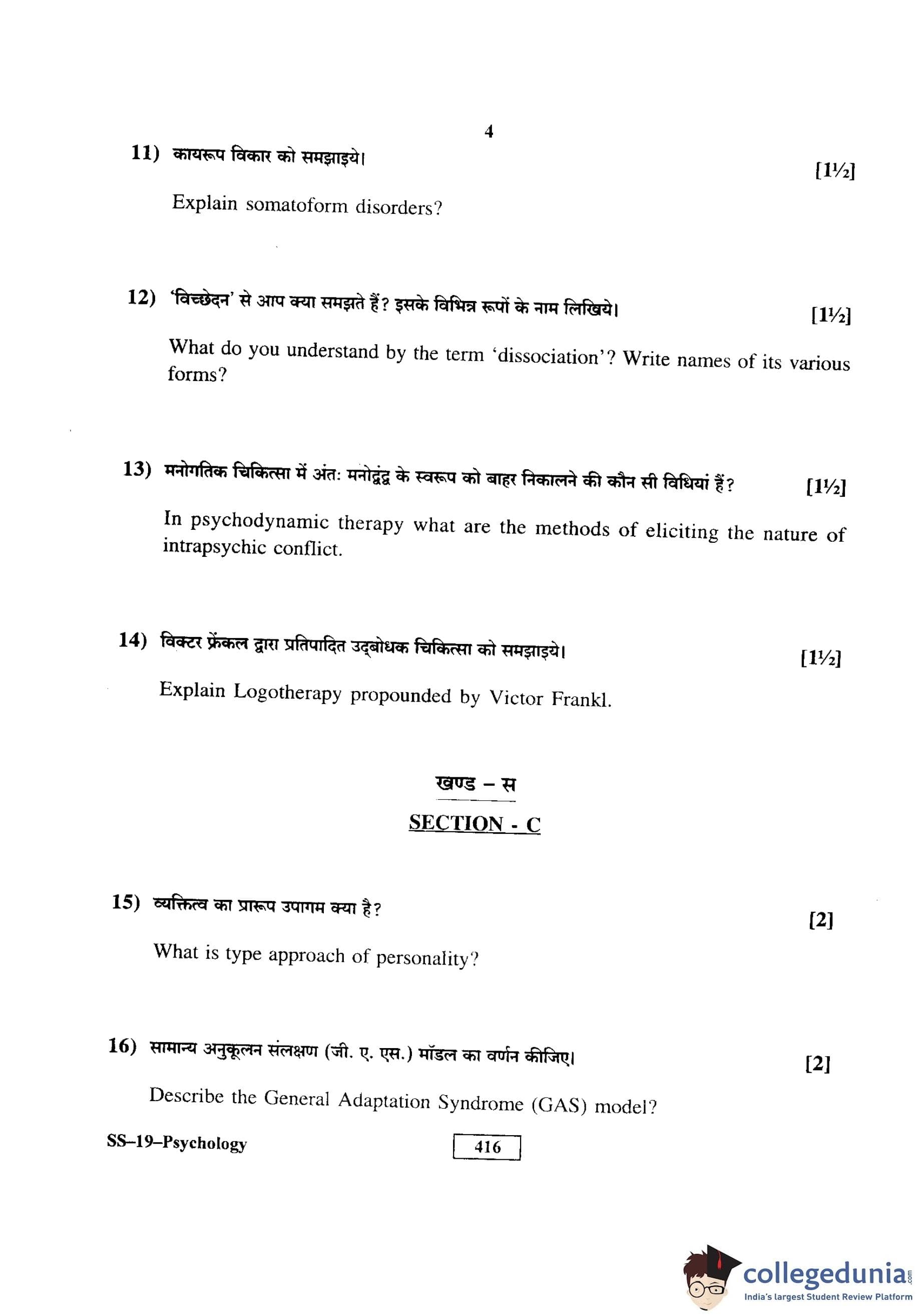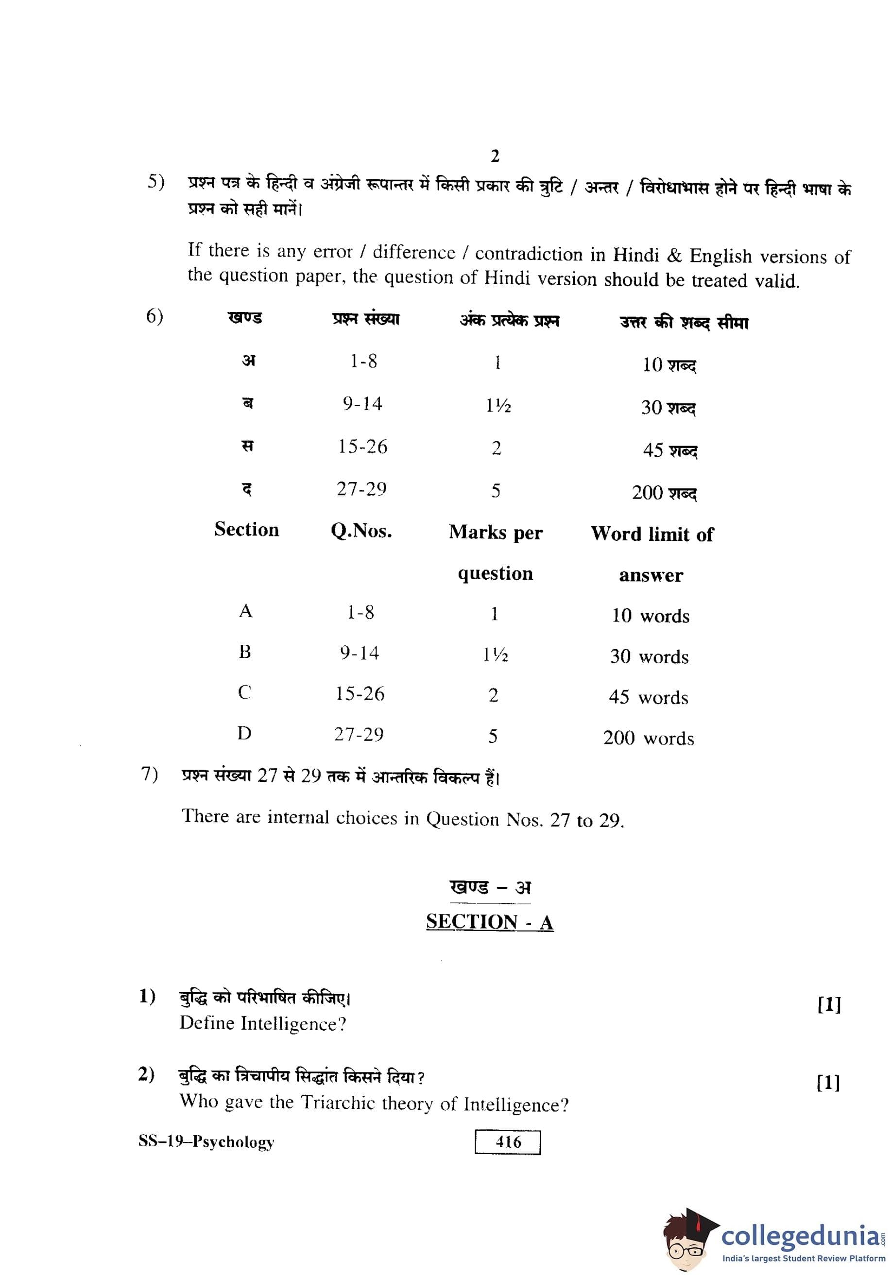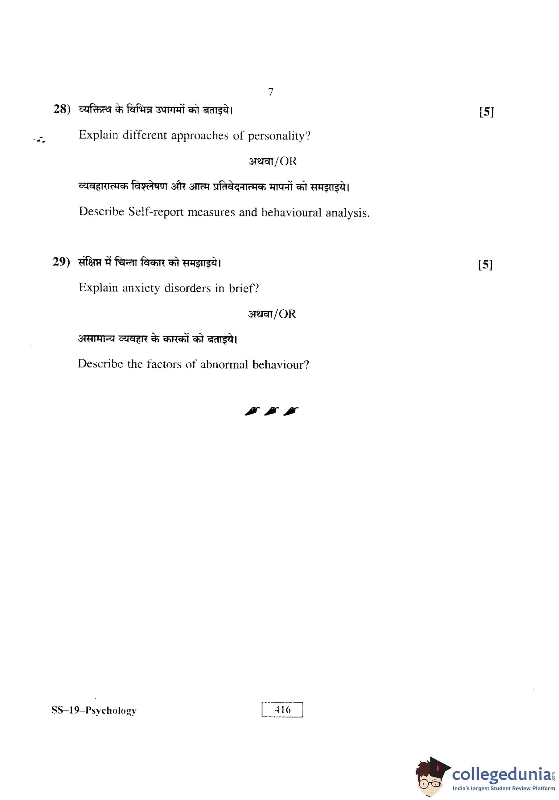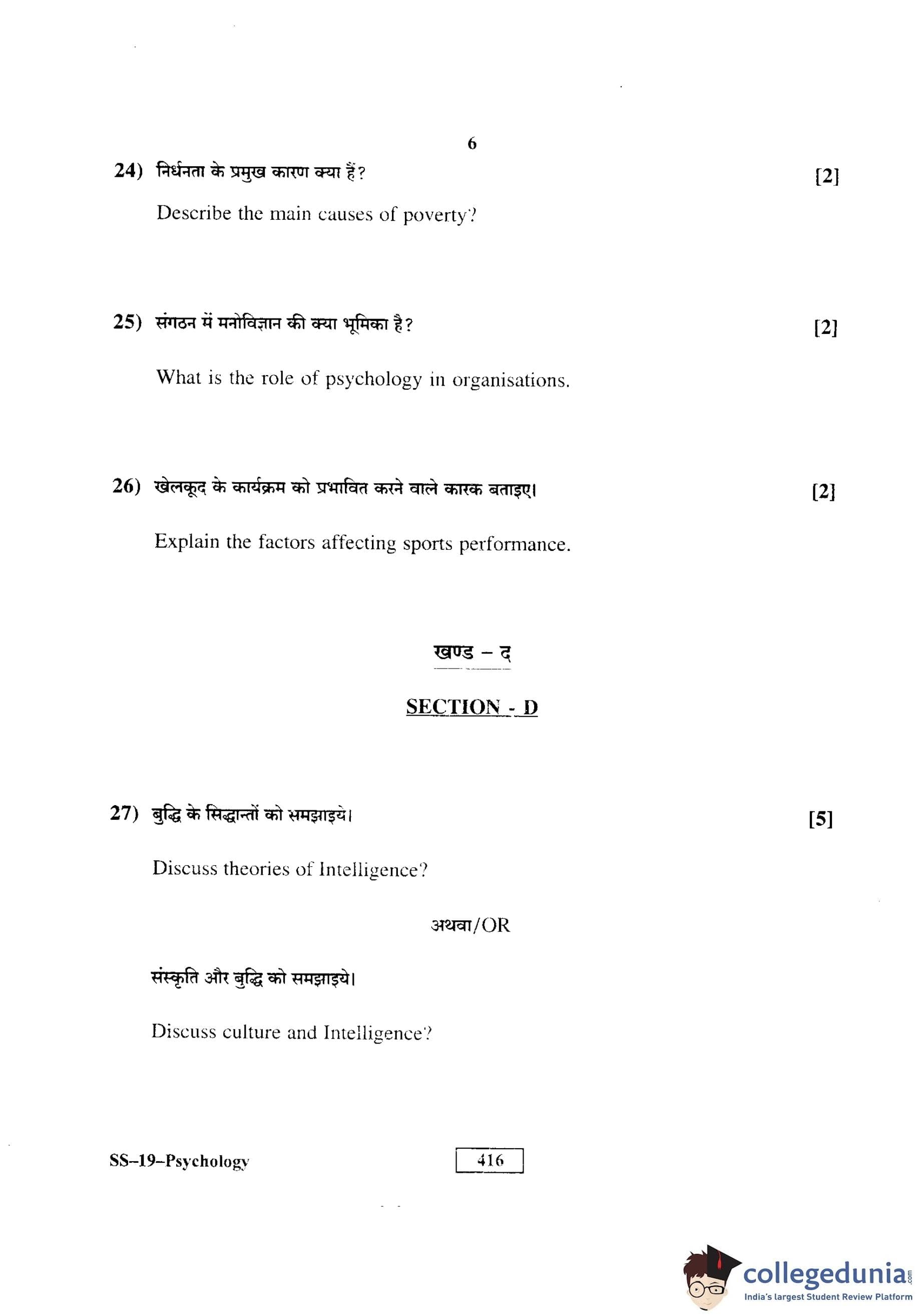 RBSE Class 12 Psychology Question Paper 2016 with Answer Key pdf is available for download here. The exam was conducted by Board of Secondary Education Rajasthan (BSER) on March 21, 2016 in the Morning Session 8:30 AM to 11:45 AM. The question paper comprised a total of 29 questions divided among 4 sections.
