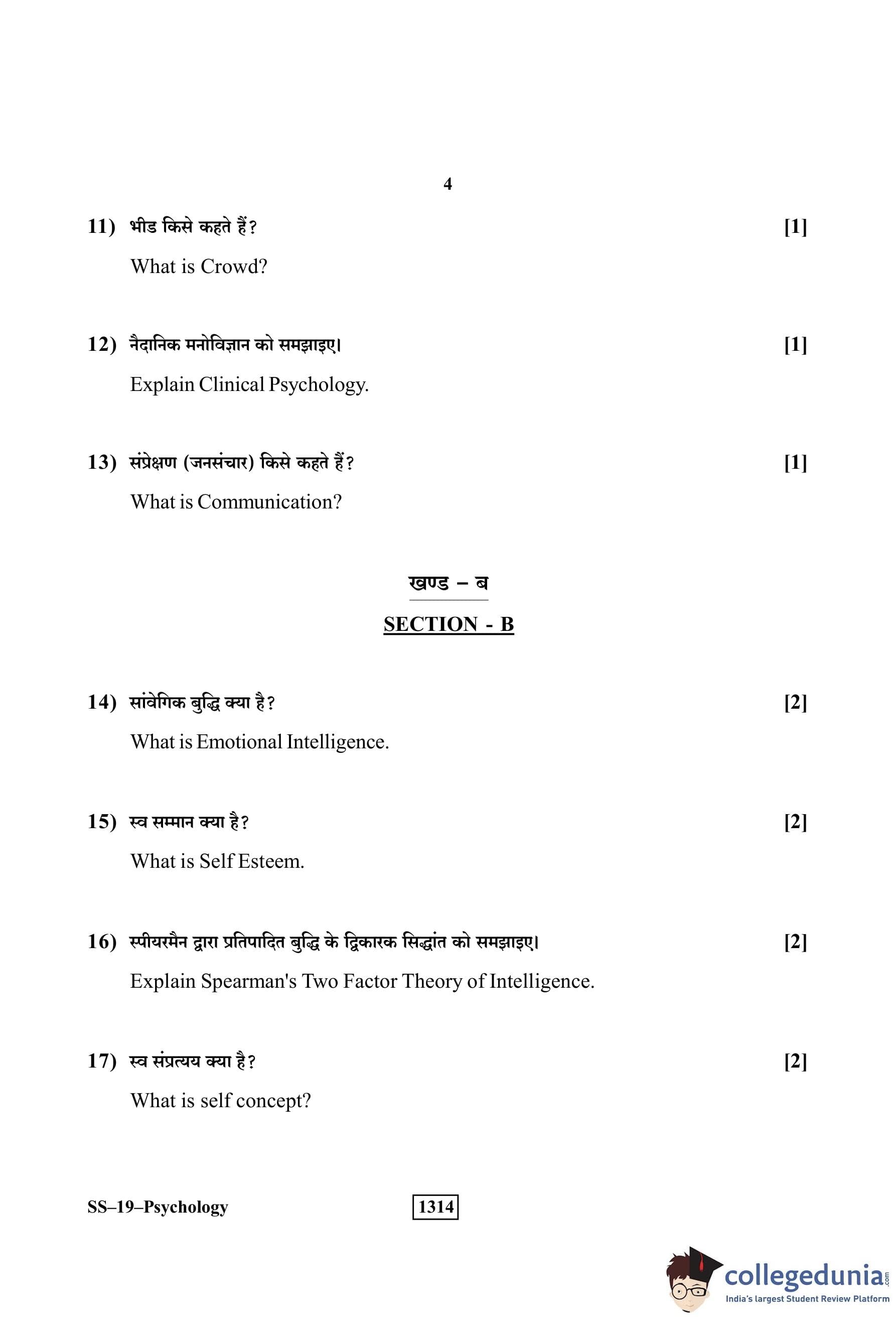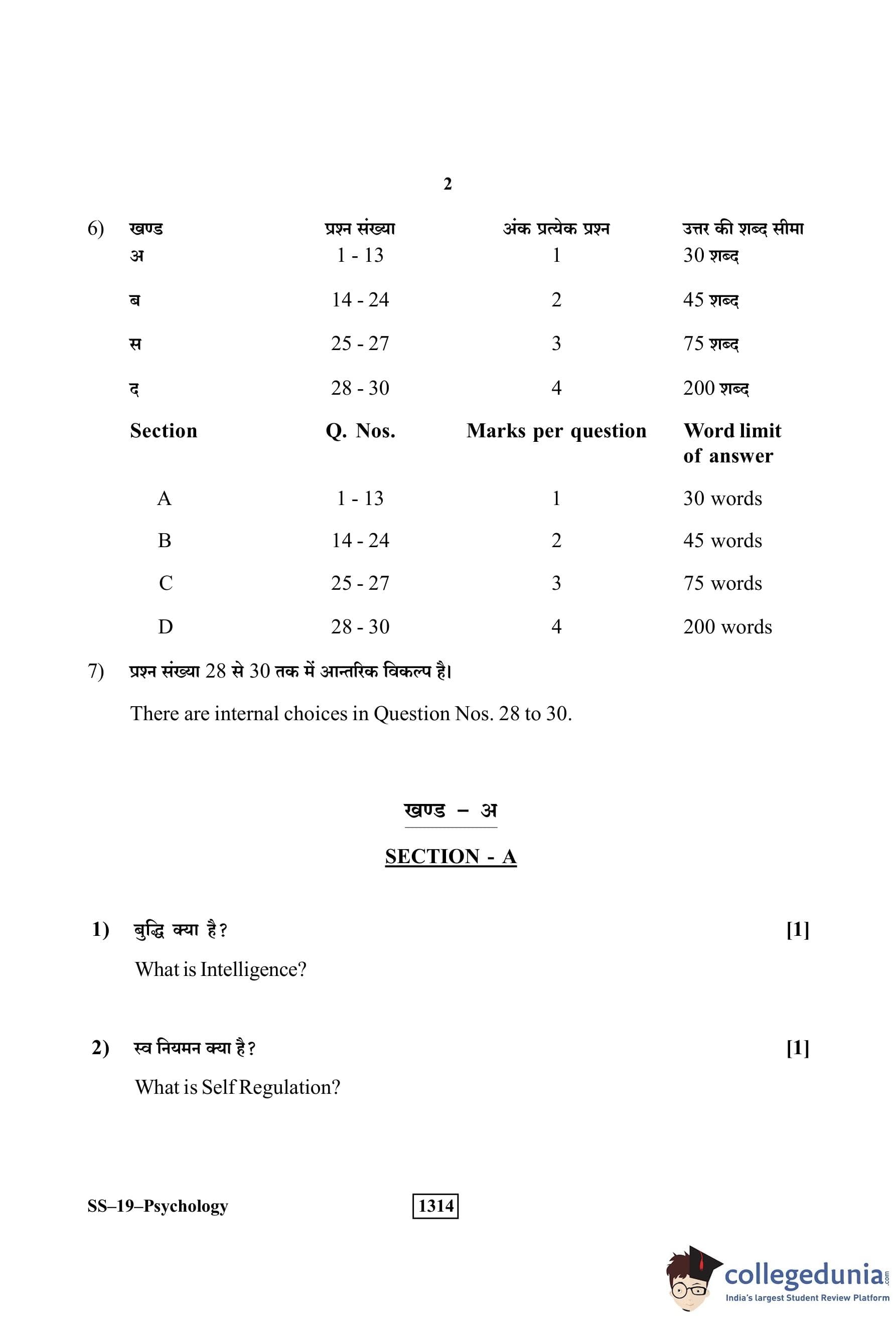 RBSE Class 12 Psychology Question Paper 2019 with Answer Key pdf is available for download here. The exam was conducted by Board of Secondary Education Rajasthan (BSER) on April 1, 2019 in the Morning Session 8:30 AM to 11:45 AM. The question paper comprised a total of 30 questions divided among 4 sections.