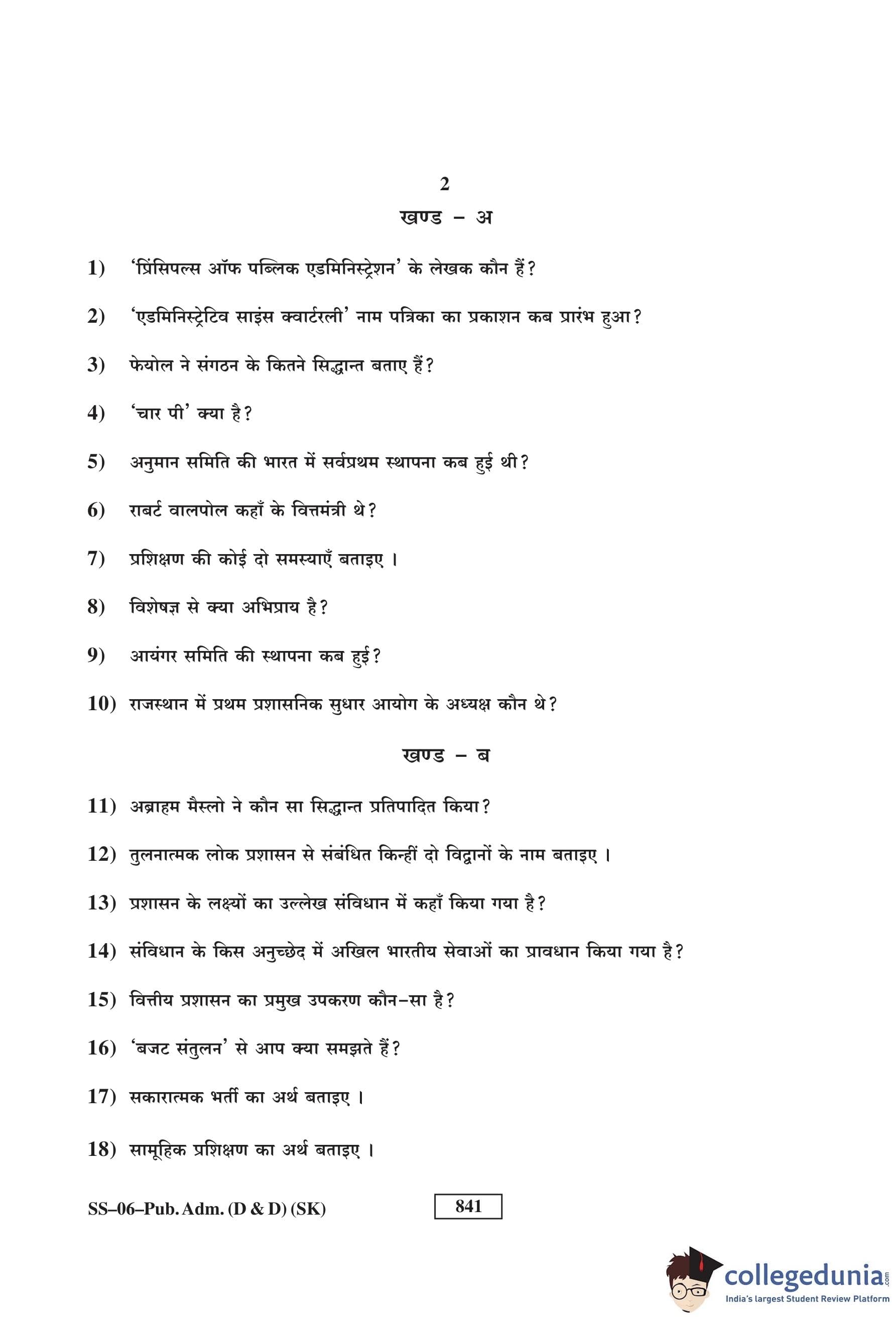 RBSE Class 12 Public Administration (D and D) Question Paper 2017 with Answer Key
