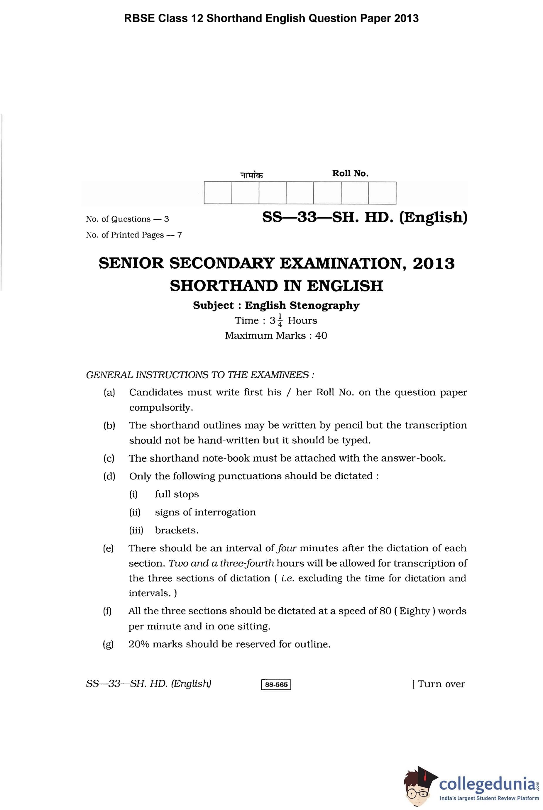 RBSE Class 12 Shorthand English Question Paper 2013 with Answer Key