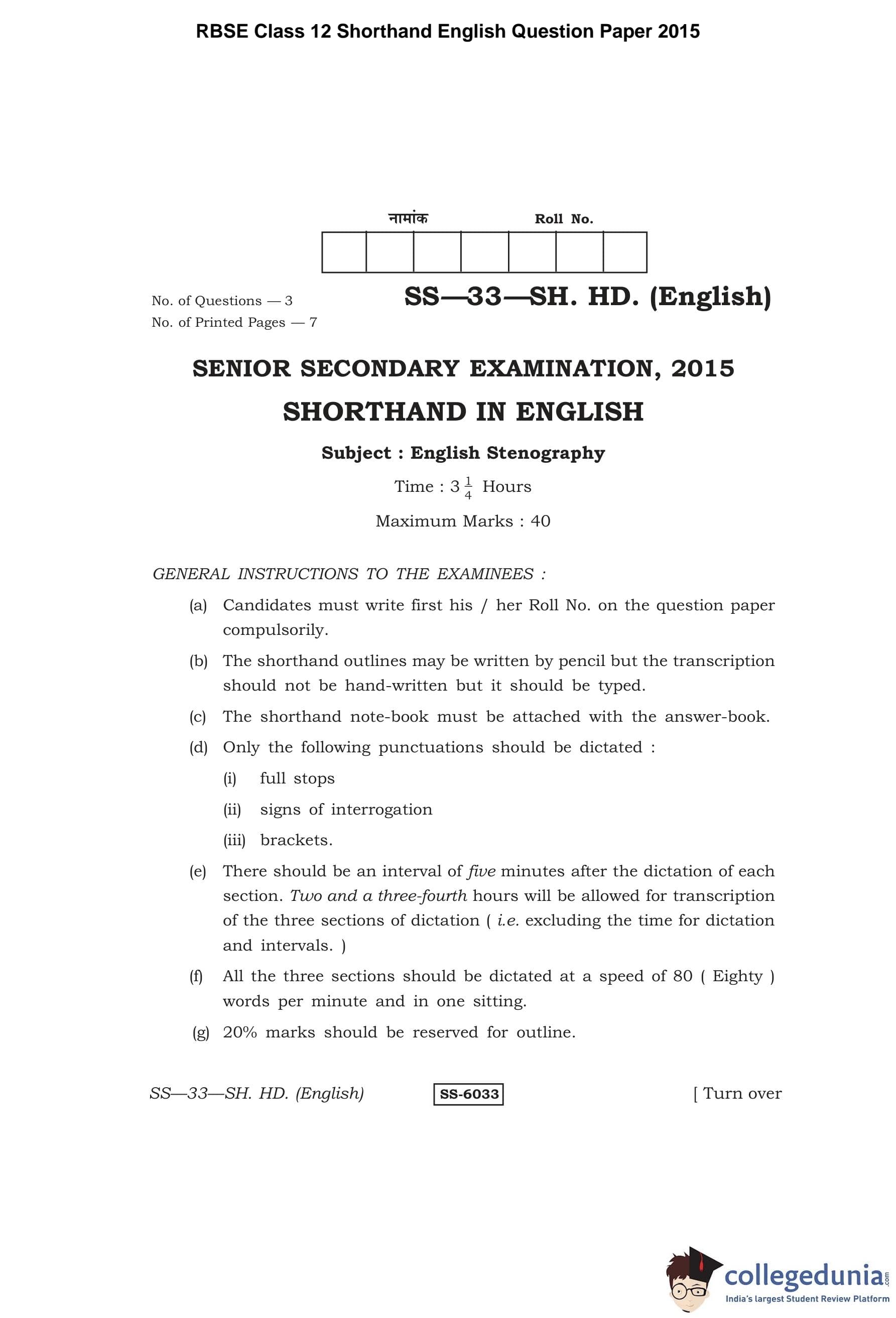 RBSE Class 12 Shorthand English Question Paper 2015 with Answer Key pdf is available for download here. The exam was conducted by Board of Secondary Education Rajasthan (BSER) on March 31, 2015 in the Morning Session 8:30 AM to 11:45 AM. The question paper comprised a total of 3 questions divided among 3 sections.