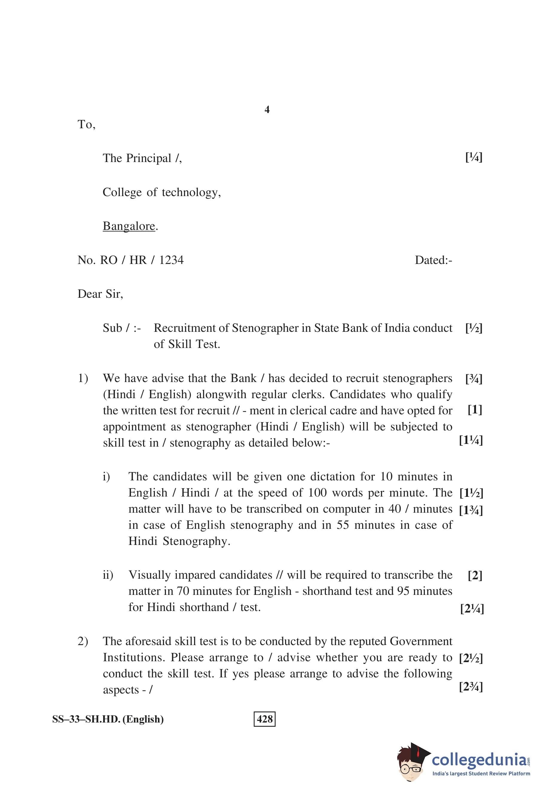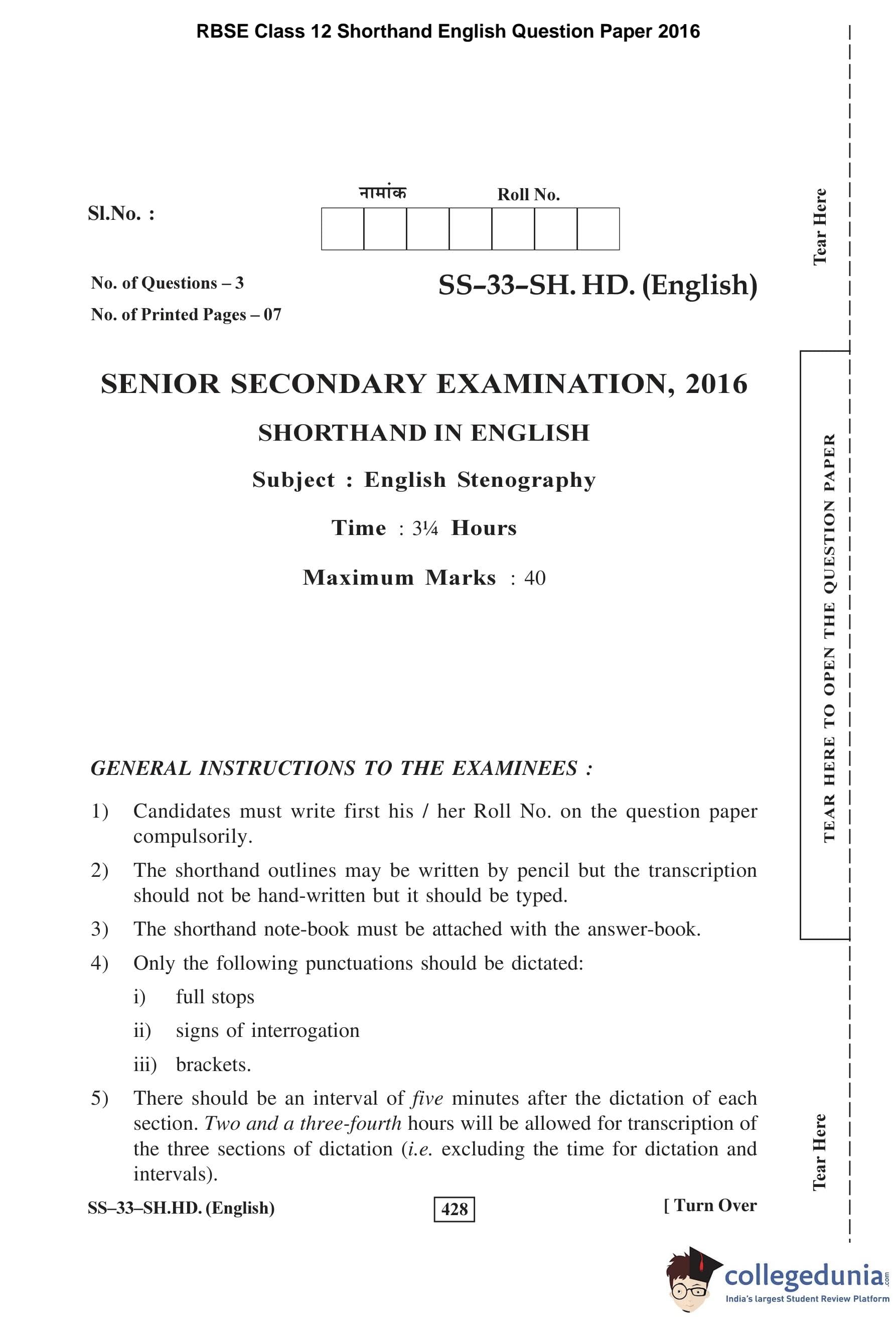 RBSE Class 12 Shorthand English Question Paper 2016 with Answer Key pdf is available for download here. The exam was conducted by Board of Secondary Education Rajasthan (BSER) on March 15, 2016 in the Morning Session 8:30 AM to 11:45 AM. The question paper comprised a total of 3 questions divided among 3 sections.