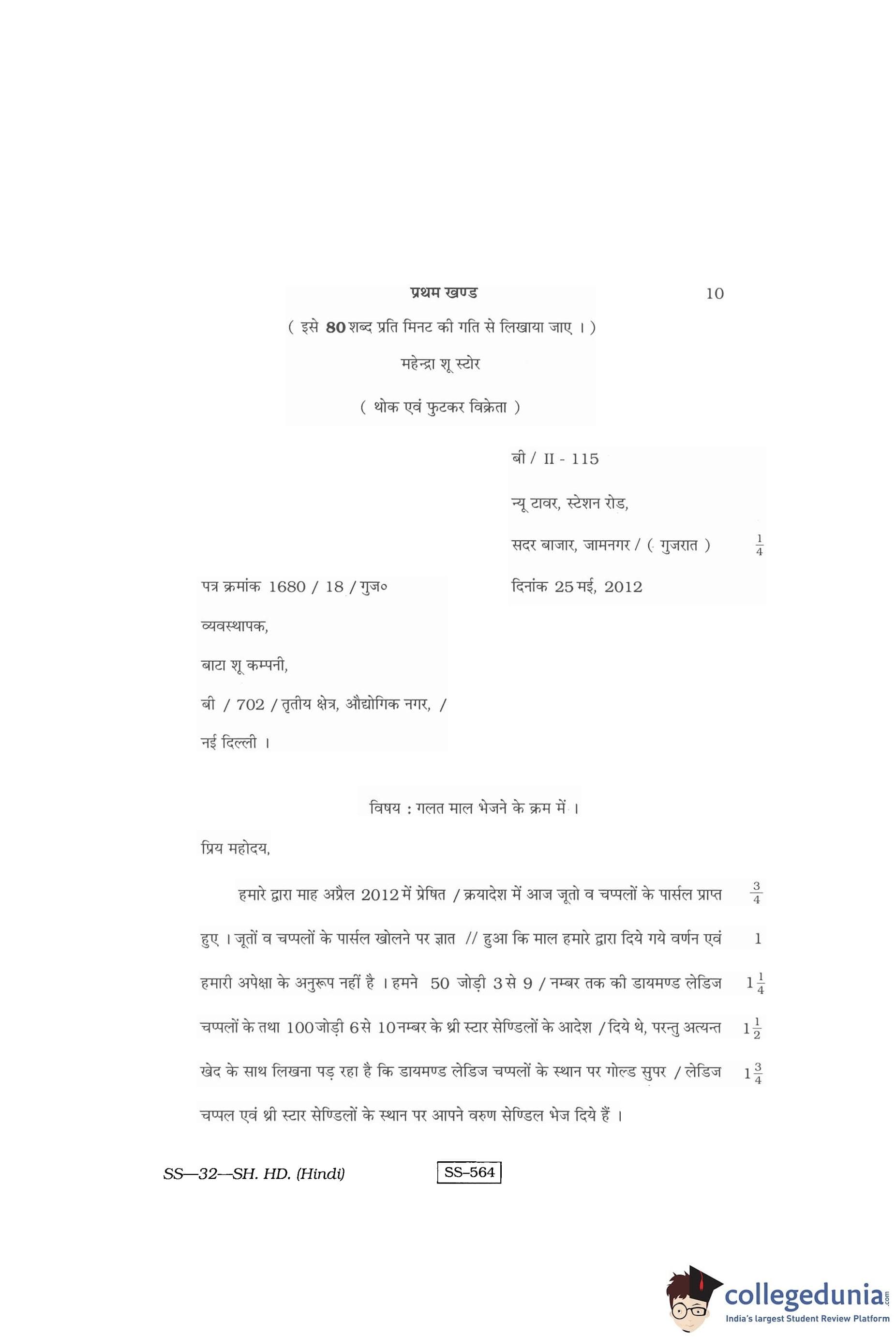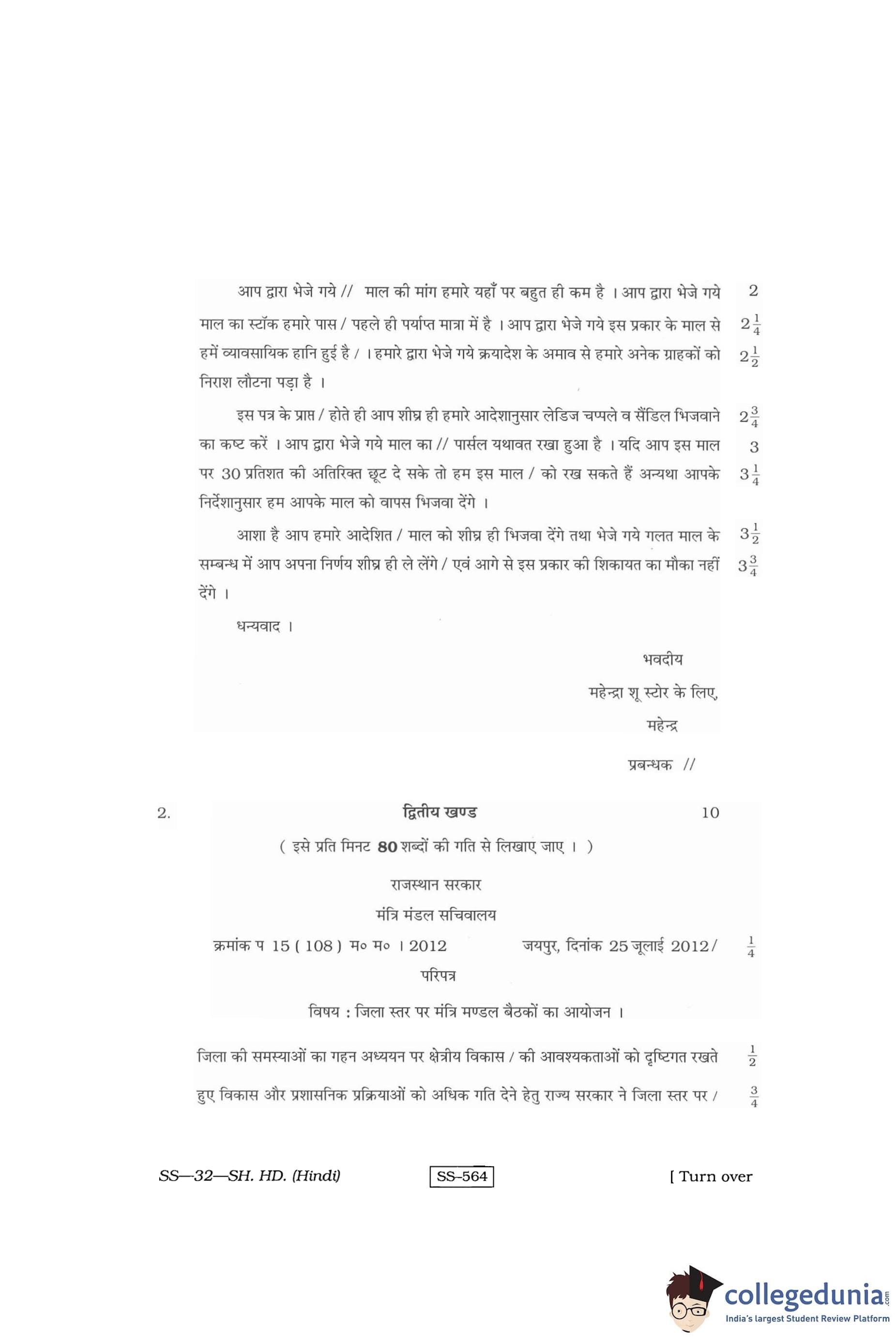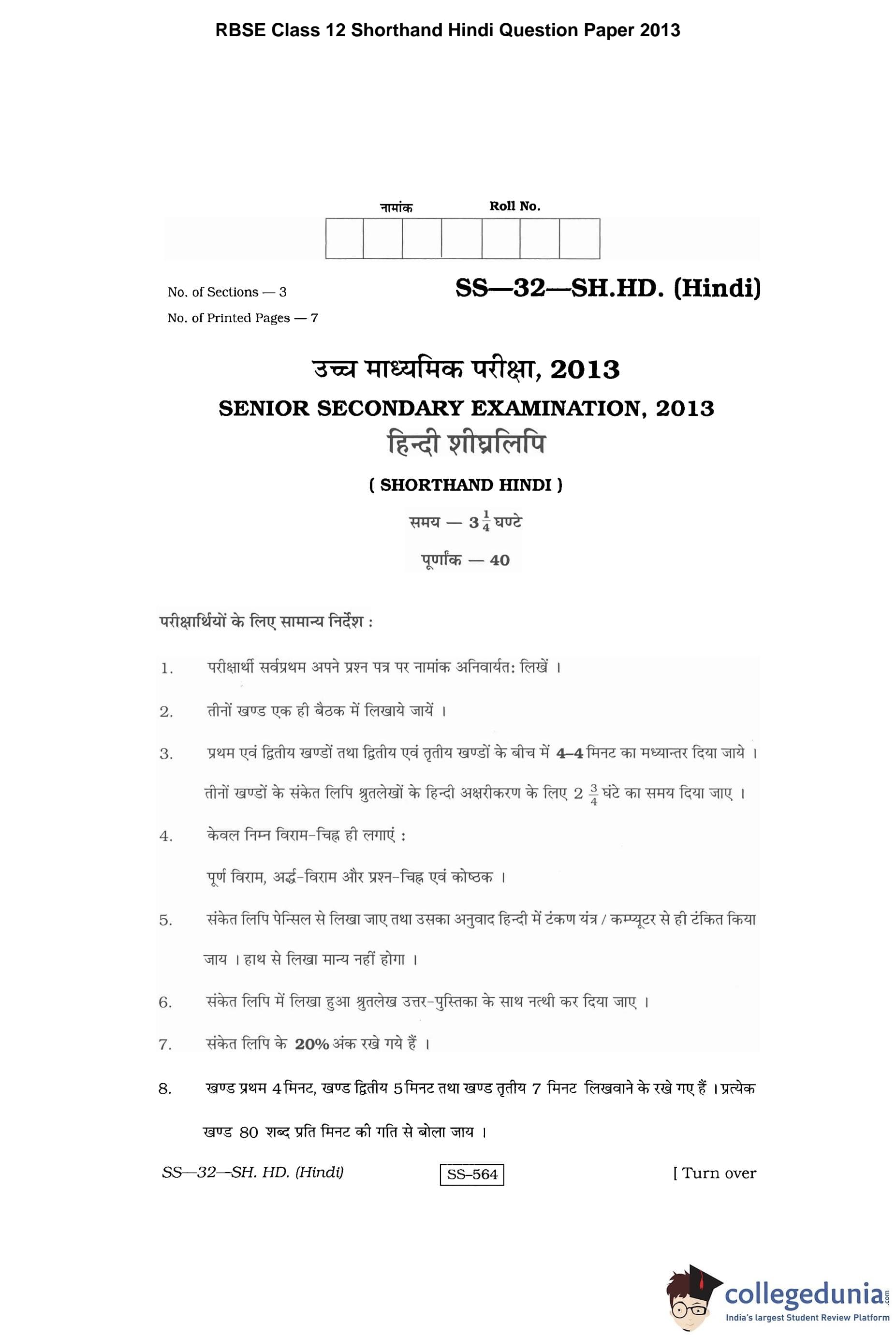 RBSE Class 12 Shorthand Hindi Question Paper 2013 with Answer Key