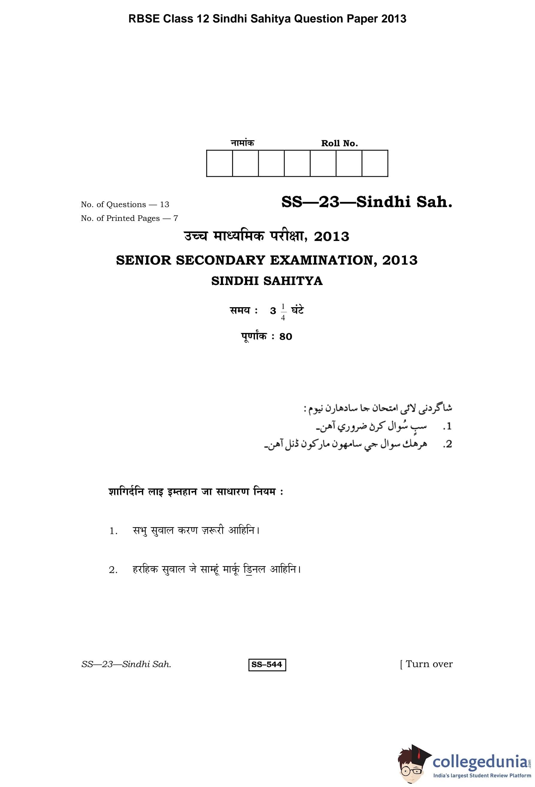 | RBSE Class 12 Sindhi Sahitya Question Paper 2013 PDF | RBSE Class 12 Sindhi Sahitya Answer Key 2013 PDF |
