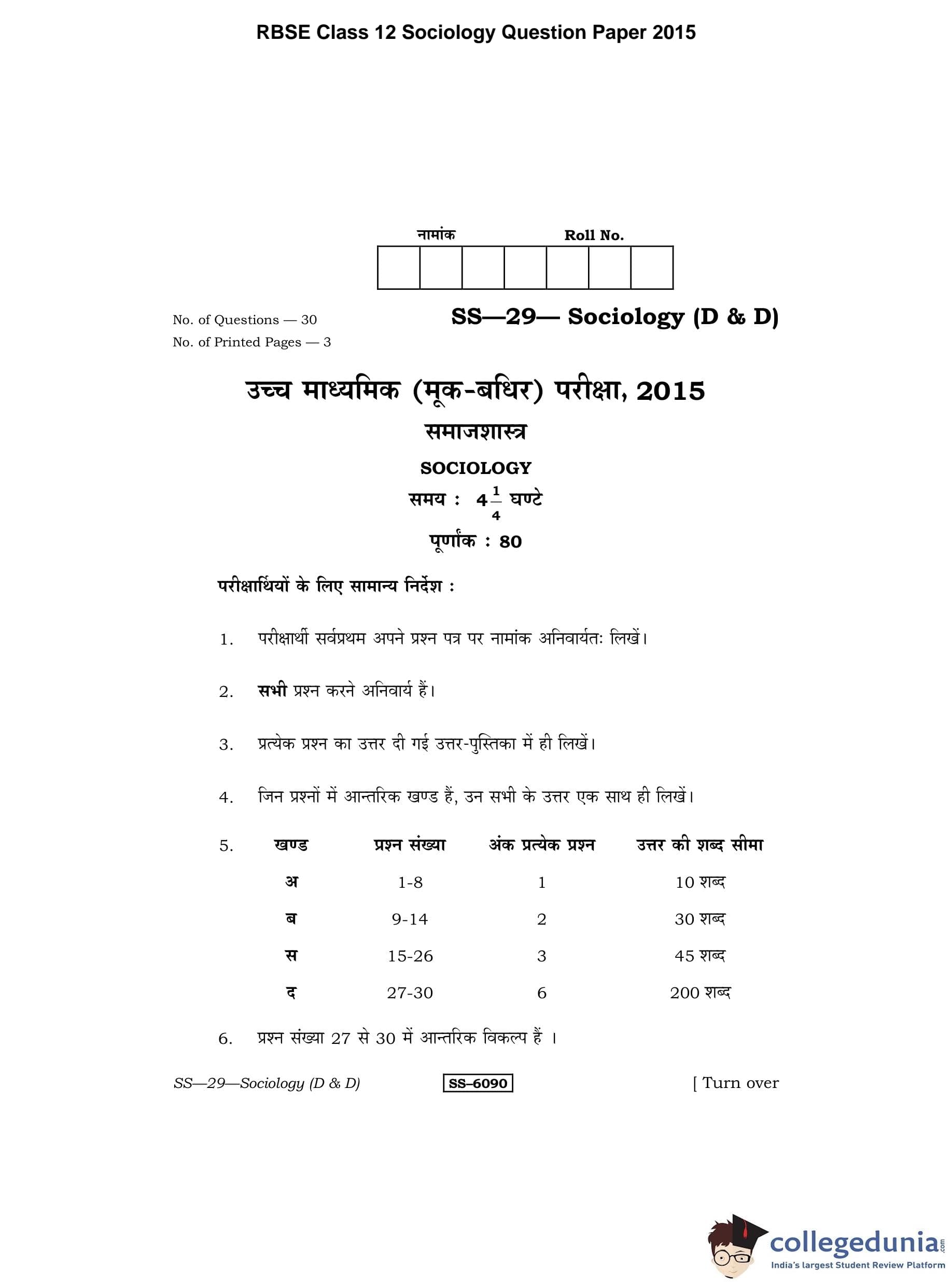 RBSE Class 12 Sociology Question Paper 2015 with Answer Key