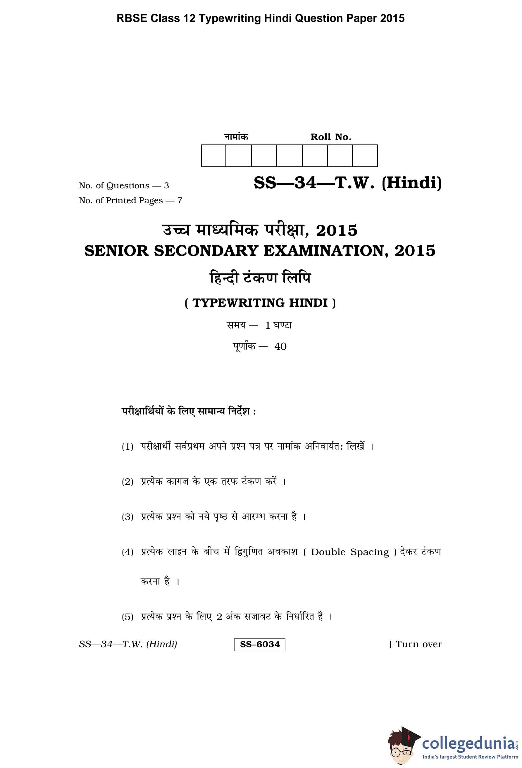 | RBSE Class 12 Typewriting Hindi Question Paper 2015 PDF | RBSE Class 12 Typewriting Hindi Answer Key 2015 PDF |