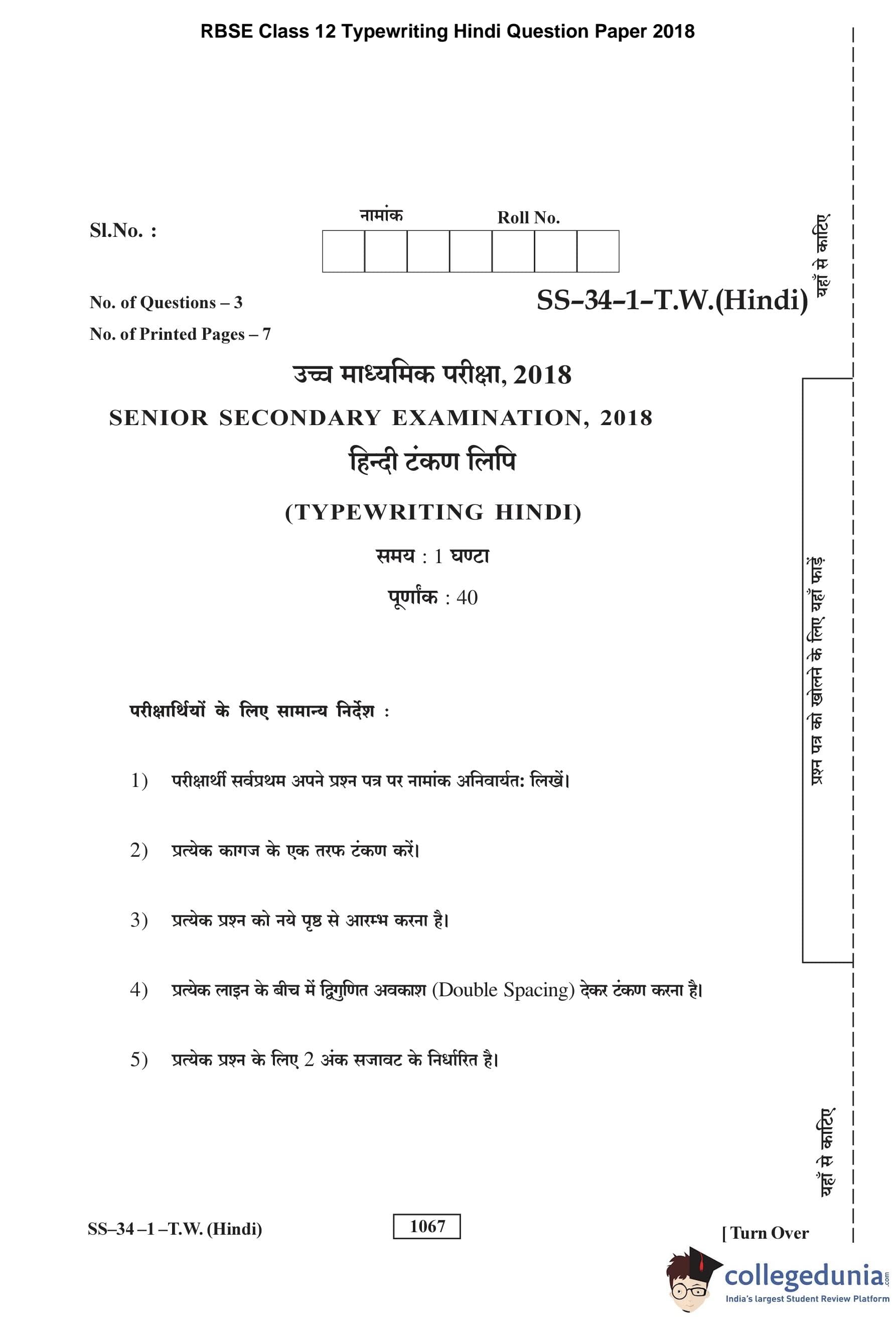 RBSE Class 12 Typewriting Hindi Question Paper 2018 with Answer Key