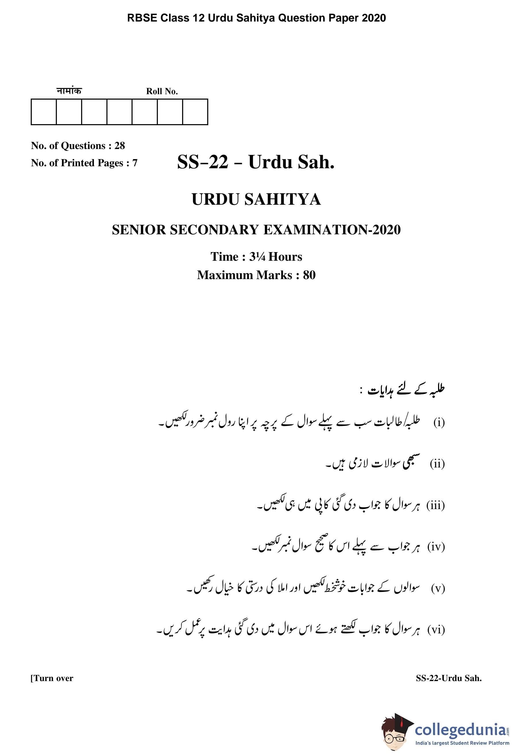 | RBSE Class 12 Urdu Sahitya Question Paper 2020 PDF | RBSE Class 12 Urdu Sahitya Answer Key 2020 PDF |