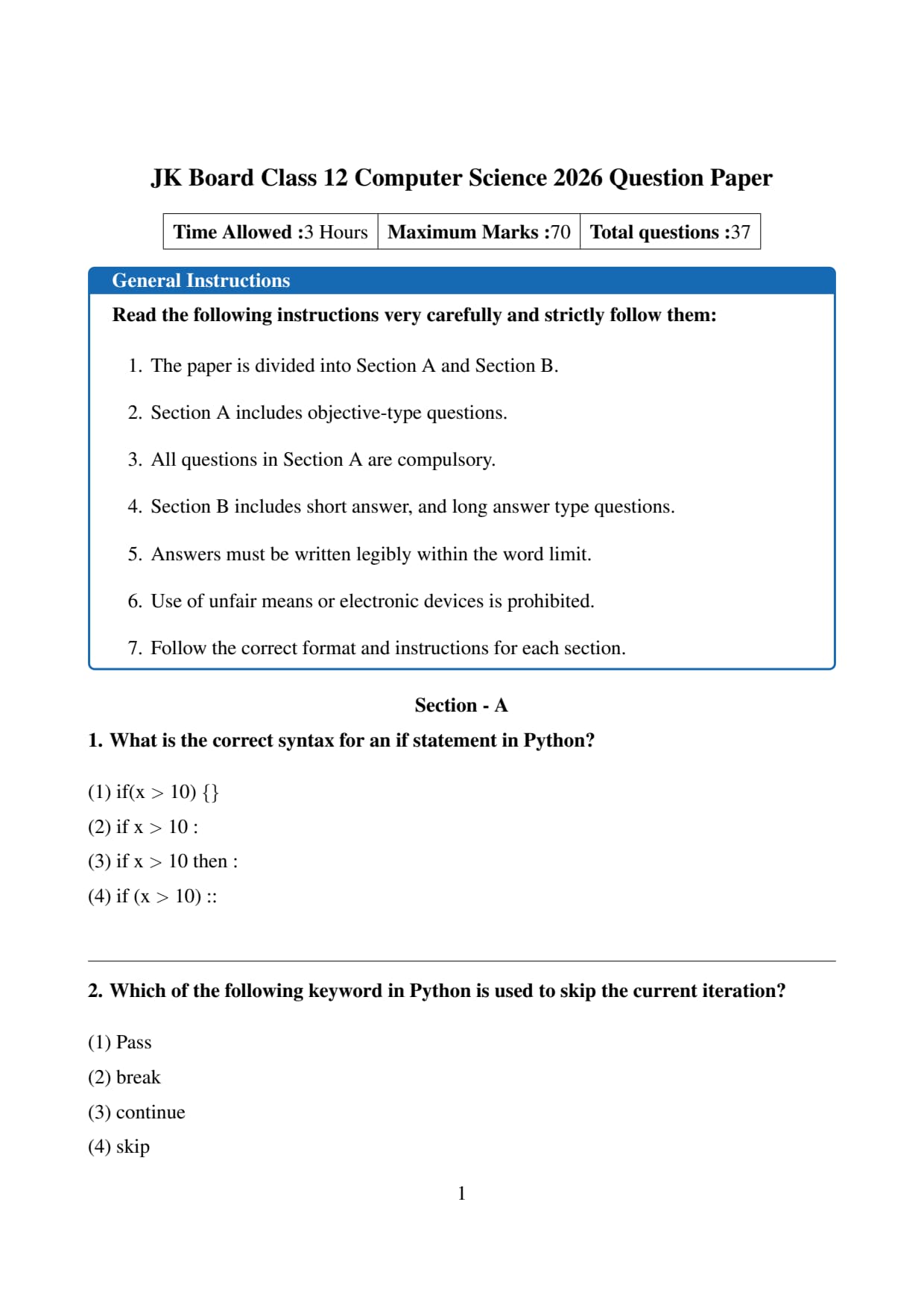 The JK Board Class 12 Computer Science paper covered key topics from programming, data structures, database management systems, and computer networks. Students should focus on coding practice, understanding programming concepts, and applying database queries. The exam is marked out of 100, with 70 marks for the theory paper and 30 for practical work and internal assessment.2 2026 Computer Science Question Paper with Solution PDF