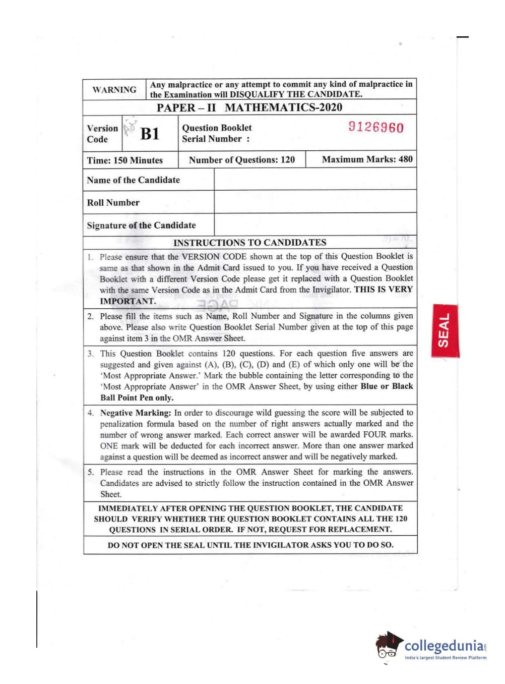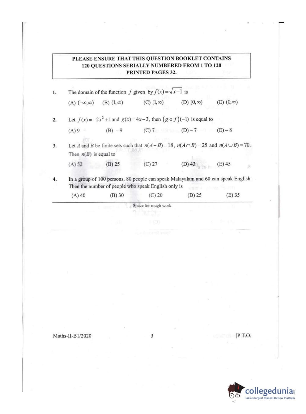 KEAM 2020 Mathematics Question paper with answer key pdf conducted on July 16, 2020 in Afternoon Session (2:30 PM to 5 PM) is available for download. The exam was successfully organized by Commissioner of Entrance Examinations Kerala. In terms of difficulty level, KEAM was of Easy level. The question paper comprised a total of 120 questions.