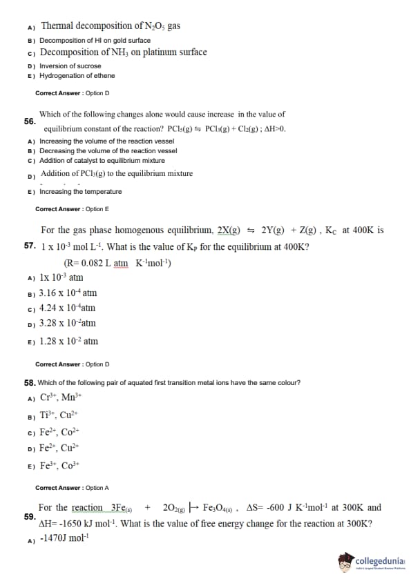 \(K_C\) at 400K is \(1 \times 10^{-3}\) mol L\textsuperscript{-1. What is the value of \(K_P\) for the equilibrium at 400K? \[ R = 0.082 L atm K^{-1} mol^{-1} \]