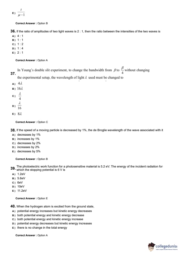 In Young’s double slit experiment, to change the bandwidth from \(\beta\) to \(\frac{\beta}{4}\) without changing the experimental setup, the wavelength of light \(\lambda\) used must be changed to