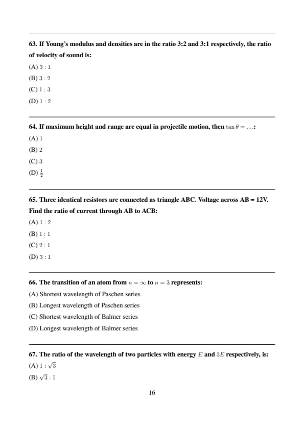 Three identical resistors are connected as triangle ABC. Voltage across AB = 12V. Find the ratio of current through AB to ACB: