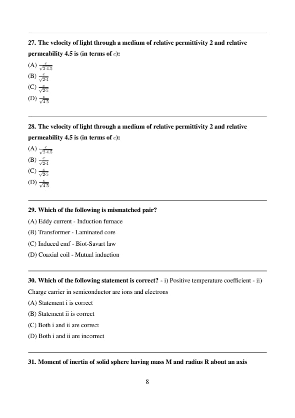The velocity of light through a medium of relative permittivity 2 and relative permeability 4.5 is (in terms of \( c \)):