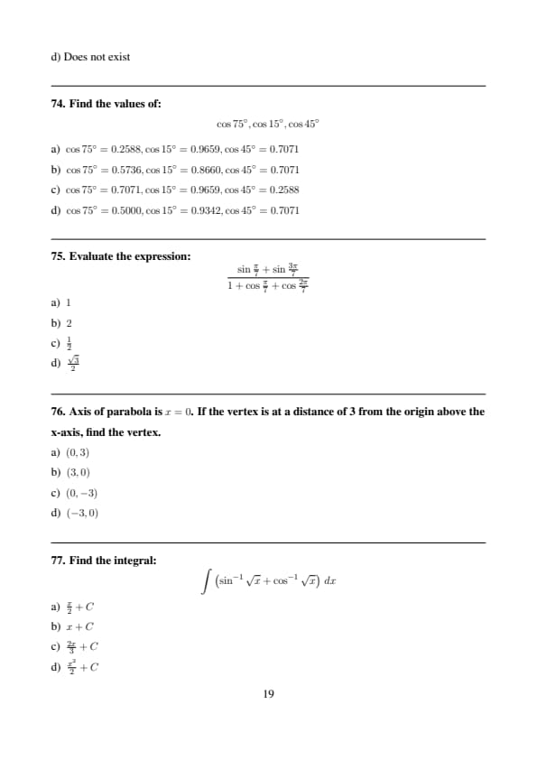 Find the values of: \[ \cos 75^\circ, \cos 15^\circ, \cos 45^\circ \]