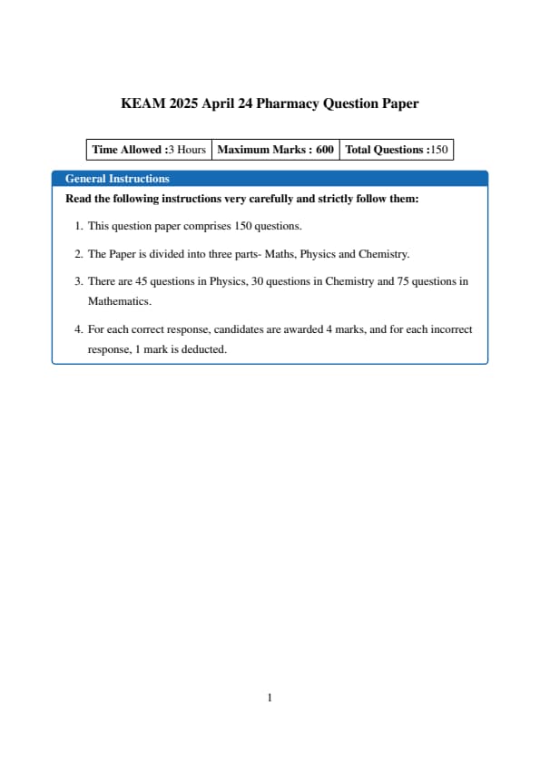 KEAM 2025 Pharmacy April 24 Shift 1 Question Paper PDF Download