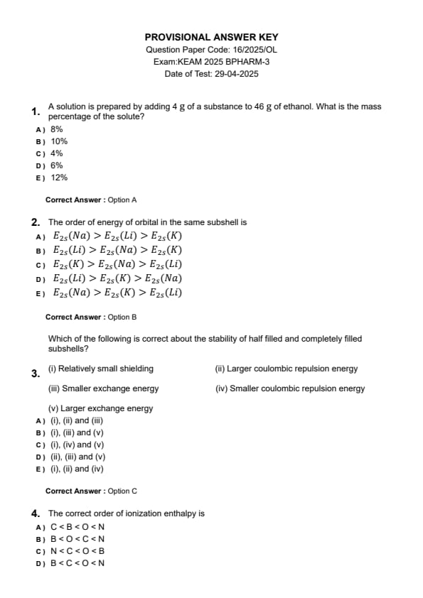 | KEAM 2025 Pharmacy Question Paper with Answer Key | Download | Check Solution |
