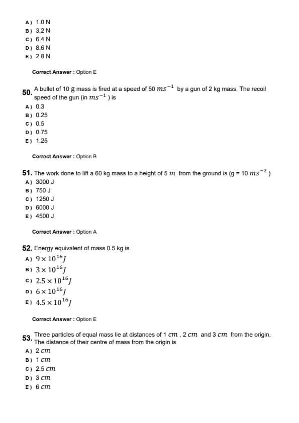 A bullet of 10 g mass is fired at a speed of 50 m/s by a gun of 2 kg mass. The recoil speed of the gun (in m/s) is