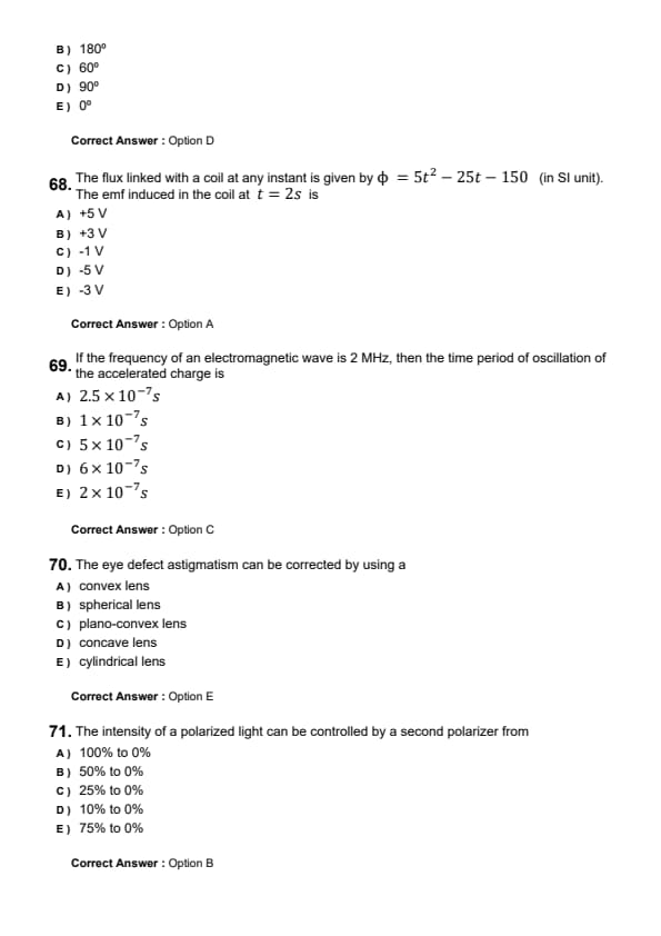 The flux linked with a coil at any instant is given by \( \Phi = 5t^2 - 25t - 150 \) (in SI units). The emf induced in the coil at \( t = 2 \) s is