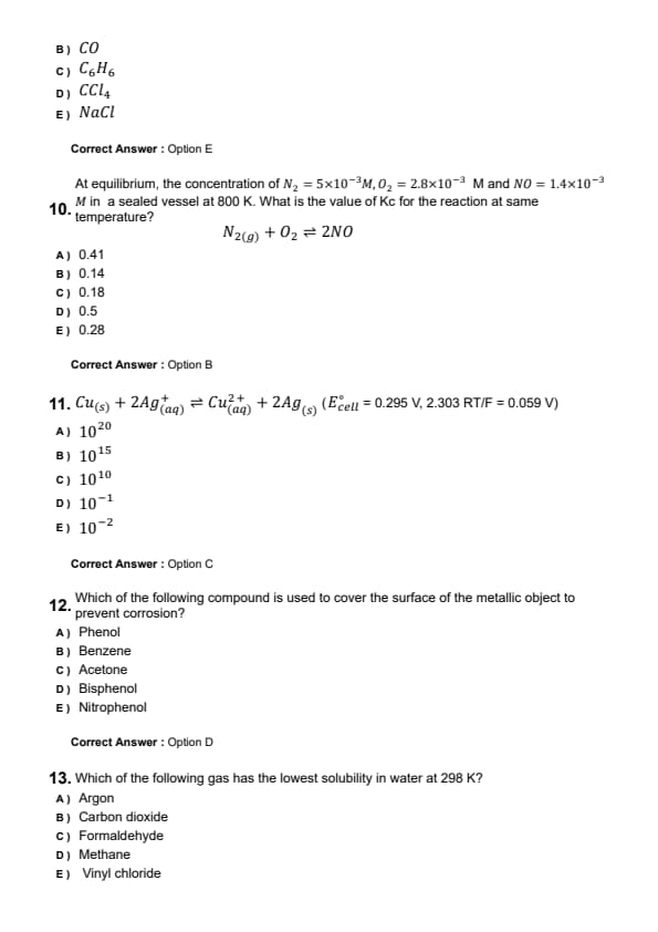 At equilibrium, the concentration of \( N_2 = 5 \times 10^{-3} \, M \), \( O_2 = 2.8 \times 10^{-3} \, M \), and \( NO = 1.4 \times 10^{-3} \, M \) in a sealed vessel at 800 K. What is the value of \( K_c \) for the reaction at the same temperature?