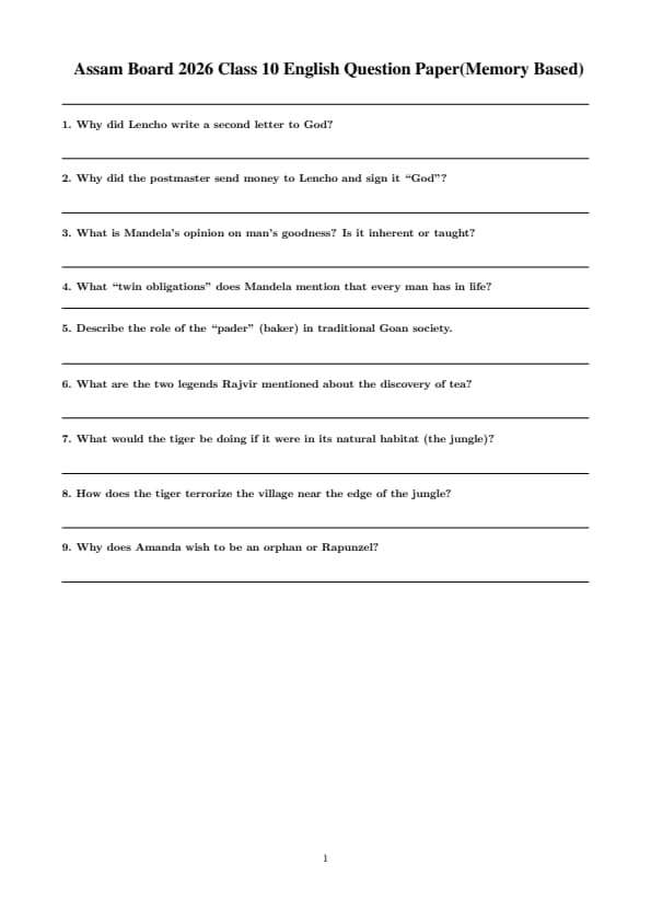 Assam Board HSLC 2026 English Question Paper with Solutions (10 Feb, 2026) – Memory Based