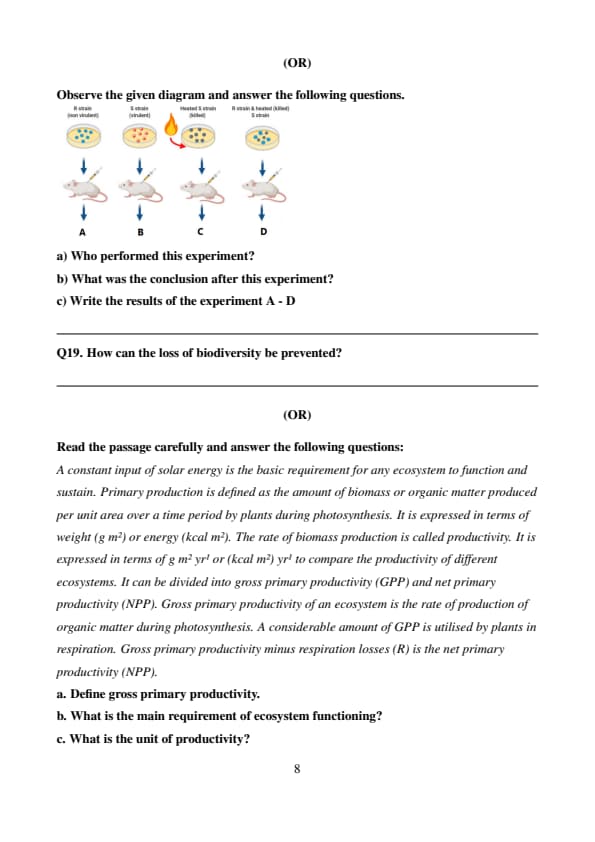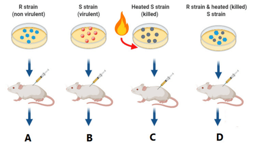 Step 3: (c) In Experiment A, when mice were injected with the virulent S-strain (smooth, polysaccharide coat), they developed pneumonia and died. Quick Tip: Griffith's experiment did not identify the biochemical nature of the transforming principle (DNA). That was later discovered by Avery, MacLeod, and McCarty.