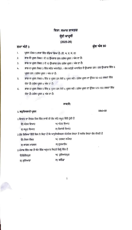 The PSEB Class 12 Sociology exam will be conducted with the question paper and solutions made available after the exam. The exam will assess students' understanding through a combination of multiple-choice, objective, short, and long answer questions within a 3-hour duration. The paper will total 100 marks, with 80 marks allotted for the theory component and 20 marks for internal assessment. There will be no negative marking for incorrect answers.