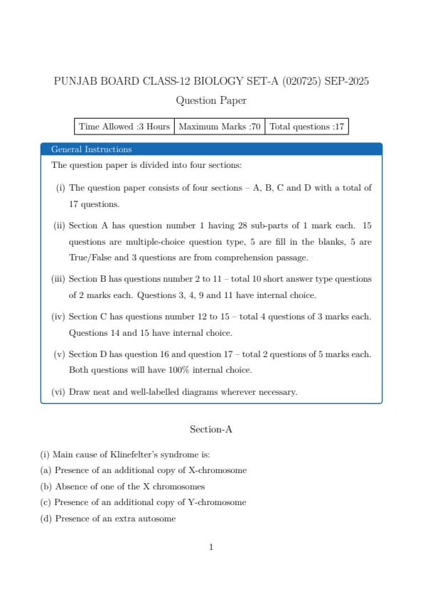 | PSEB Class 12 Biology 2025 Question Paper with Solutions PDF(Set A) | Download PDF | Check Solutions |